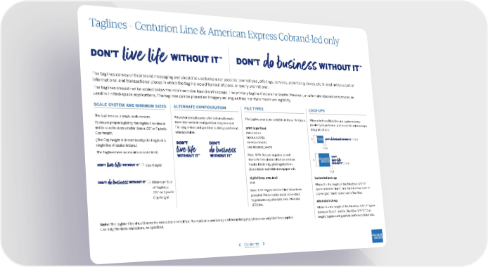 Taglines – Centurion Line & American Express Cobrand-led only The taglines convey critical brand messaging and should be used whenever possible: promotional, offerings, services, advertising pieces, etc. It need not be a part of informational and transactional pieces in which the tagline would feel out of place, or overly promotional. The taglines should not be scaled below the minimum size found on this page. The primary tagline files are horizontal. However, an alternate stacked version can be used in limited-space applications. The taglines can be placed on imagery as long as they maintain maximum legibility. SCALE SYSTEM AND MINIMUM SIZES ALTERNATE CONFIGURATION FILE TYPES LOCK-UPS The taglines use a single scale version. When horizontal space is limited an alternate The tagline assets are available in these file-types: When a lock-up (Blue Box and tagline in close To ensure proper legibility, the tagline files should three-line vertical configuration may be used. proximity) is preferred, please use the relationships not be used in sizes smaller than a .05” or 7 pixels The single-line configuration is always preferred, print (eps files) designated here: Cap-height. when possible. pms coated pms uncoated X 1/ X 6 (The Cap-height is determined by the height of a cmyk (4-color) single line of capital letters.) and reverse_white 1/ X 3 The Taglines have no maximum scale limit. Note: B/W files are supplied as well. The B/W files should ONLY be used on X 1/ X Cap-height 1-color, black-only, print applications 9 (like a black-and-white newspaper ad). 1/ X 5 Minimum Size digital (svg, png, jpg) horizontal lock-up of Taglines: rgb Where X = the height of the Blue Box: 1/3 “X” .05” or 7 pixels Note: EPS “Digital Master Files” have been space between “don’t” and the Blue Box; 1/6 “X” Cap-height provided. These can be used, as needed, cap-height; “don’t” centered to Blue Box. to generate any alternate SVG, PNG and alternate lock-up JPG files. Where X = the height of the Blue Box: 1/5 “X” space between “Don’t” and the Blue Box; 1/9 “X” Cap- Note: The tagline files should never be recreated or modified. To maintain consistency and brand integrity, please use only the files supplied. height; tagline configuration centered to Blue Box. Use only the sizes and colors, as specified. ‹ Contents ›