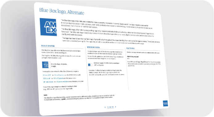 Blue Box logo, Alternate The Blue Box logo, Alternate was created to make a powerful impression in a small space world. This logo should be reserved for American Express social media, app use, and mobile contexts where scale is restricted (e.g. mobile banners). It can also be used as an acceptance mark in small or hard to read spaces. The Blue Box logo, Alternate is a supporting logo only; research indicates that our audience prefers the “American Express” logo remain foremost. The Alternate logo should only replace the core Blue Box logo in the small scale, digital environments (noted above) where its clarity and boldness excels. The logo has been drawn to maintain legibility/continuity throughout the visual identity (from extra small to regular scales). Three scale versions have been provided (see right). The logo should not be scaled below the minimum sizes (per scale) found on this page. SCALE SYSTEM MINIMUM SIZES FILE TYPES The Blue Box logo, Alternate files have been provided at three To ensure proper legibility, the Blue Box logo files should not be The Blue Box logo, Alternate assets are available in these file-types: scales: Extra Small, Small, and Regular. used in sizes smaller than those listed above, right (per scale). The height of the Blue Box logo determines the scale version For small scale applications the “extra small” logo should never digital (svg, png, jpg) (at right) that should be used. be used smaller than a height of .175” or 22 pixels. rgb Note: EPS (and InDesign) “Digital Master Files” have been provided. Minimum height of EXTRA SMALL scale logo: These can be used, as needed, to generate any alternate SVG, PNG Blue Box logo, Alternate, .175" or 22 pixels Height and JPG files. In an application, when the Blue Box (Alternate) height is: Exception: If a Blue Box logo is needed at a height below the minimum above, the Alternate logo may be substituted: .175 to .225” or 22 to 32 pixels use the extra small scale from 175” or 22 pixels, up to .325” or 40 pixels (minimum above). .225 to .45” or 32 to 50 pixels use the small scale .45” and above or 50 pixels and above use the regular scale Note: If the logo’s height is a shared, meeting number (e.g. .225”, or .45”), please use the larger scale. Note The Blue Box logo Alternate files, custom drawn to work at different scales, should never be recreated or modified. To maintain consistency, legibility, and brand integrity, please use only the files supplied at their correct scales. ‹ Contents ›