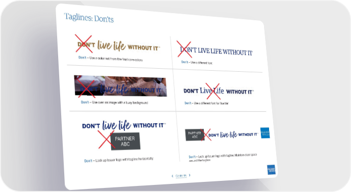 Taglines: Don’ts DON’T LIVE LIFE WITHOUT IT Don’t – Use a color not from the final core colors Don’t – Use a different font Live Life Don’t – Use over an image with a busy background Don’t – Use a different font for ‘live life’ PARTNER PARTNER ABC ABC Don’t – Lock up Issuer logo with tagline horizontally Don’t – Lock up Issuer logo with tagline. Maintain clear space around the tagline ‹ Contents ›