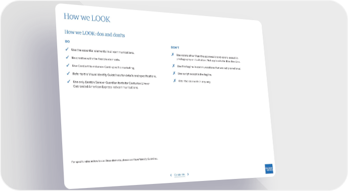 How we LOOK How we LOOK: dos and don’ts DO DON’T ✓ Use the essential elements in all communications. ✗ Use colors other than the approved brand colors, except in photography or illustration. Not applicable for Blue Box Line. ✓ Be creative with the flexible elements. ✗ Use the tagline in communications that are not promotional. ✓ Use Card art to enhance Card-specific marketing. ✗ Use script except in the tagline. ✓ Refer to the Visual Identity Guidelines for details and specifications. ✗ Alter the elements in any way. ✓ Use only Benton Sans or Guardian fonts for Centurion Line or Cobranded American Express-led communications. For specific rules on how to use these elements, please see Visual Identity Guidelines. ‹ Contents ›