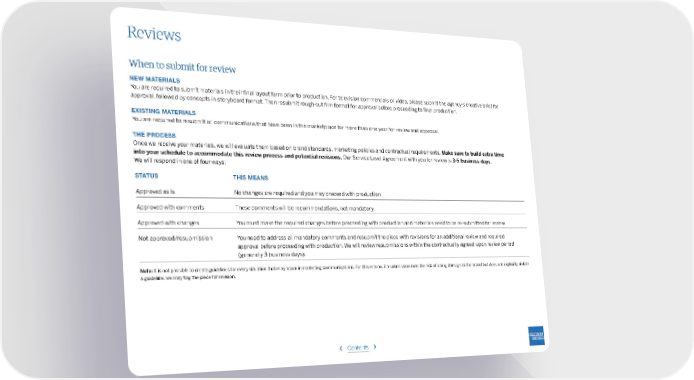 Reviews When to submit for review NEW MATERIALS You are required to submit materials in their final layout form prior to production. For television commercials or video, please submit the agency’s creative brief for approval, followed by concepts in storyboard format. Then resubmit rough-cut film format for approval before proceeding to final production. EXISTING MATERIALS You are required to resubmit all communications that have been in the marketplace for more than one year for review and approval. THE PROCESS Once we receive your materials, we will evaluate them based on brand standards, marketing policies and contractual requirements, Make sure to build extra time into your schedule to accommodate this review process and potential revisions. Our Service Level Agreement with you for review is 3-5 business days. We will respond in one of four ways: STATUS THIS MEANS Approved as is No changes are required and you may proceed with production. Approved with comments These comments will be recommendations, not mandatory. Approved with changes You must make the required changes before proceeding with production and materials need to be re-submitted for review. Not approved/resubmission You need to address all mandatory comments and resubmit the piece with revisions for an additional review and required approval before proceeding with production. We will review resubmissions within the contractually agreed-upon review period (generally 3 business days). Note: It is not possible to create guidelines for every situation that may occur in marketing communications. For this reason, if a submission runs the risk of doing damage to the brand but does not explicitly violate a guideline, we may flag the piece for revision. ‹ Contents ›