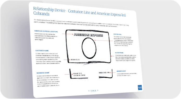 Relationship Device – Centurion Line and American Express-led Cobrands The Relationship Device (or RD) is a graphic element that is used repeatedly across American Express platform communications. It can only be used once in any communication. This asset symbolizses the relationship between American Express and Cardmembers, merchants, and business owners. AMERICAN EXPRESS LOGOTYPE CENTER OVAL A hand-drawn asset that matches the The customer replaces the Centurion and expressiveness of the Relationship Device. becomes the hero of the communication. It should always be fully visible and This strengthens the concept of relationships never cropped. and American Express putting its customers first. Oval should be organically integrated with photo, not stamped on top. CUSTOMER NAME OUTER FRAME Customer and business names are used to reinforce the individuality of the design. A hand-drawn asset which can be scaled to frame Names should be customized per execution hero of communication. Brush strokes cannot be to match the gender and diversity of the MEAGHAN ELLIS altered but multiple expressions are available. featured person. Countries to insert regionally Only two sides may be cropped off of a picture. nuanced customer and/or business names. BUSINESS NAME MEMBER SINCE MEAGHAN ELLIS Business names should be included in SILVERBIRD STORAGE Can be used in Cardmember communications applicable executions. These should also to reinforce the value of loyalty. be customized per execution to match the represented business type. Countries to insert regionally nuanced customer and/or business name within the device. ‹ Contents ›