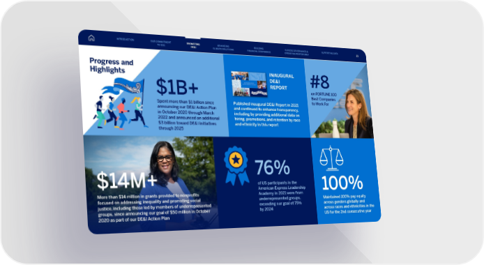 100% Maintained 100% pay equity across genders globally and across races and ethnicities in the US for the 2nd consecutive year 76% of US participants in the American Express Leadership Academy in 2021 were from underrepresented groups, exceeding our goal of 75% by 2024 More than $14 million in grants provided to nonprofits focused on addressing inequality and promoting social justice, including those led by members of underrepresented groups, since announcing our goal of $50 million in October 2020 as part of our DE&I Action Plan $14M+ Spent more than $1 billion since announcing our DE&I Action Plan in October 2020 through March 2022 and announced an additional $3 billion toward DE&I initiatives through 2025 $1B+ Published inaugural DE&I Report in 2021 and continued to enhance transparency, including by providing additional data on hiring, promotions, and retention by race and ethnicity in this report INAUGURAL DE&I REPORT #8 on FORTUNE 100 Best Companies to Work For Progress and Highlights INTRODUCTION PROMOTING DE&I ADVANCING CLIMATE SOLUTIONS BUILDING FINANCIAL CONFIDENCE OUR ESG GOVERNANCE & OPERATING RESPONSIBLY SUPPORTING DATA OUR COMMITMENT TO ESG 21