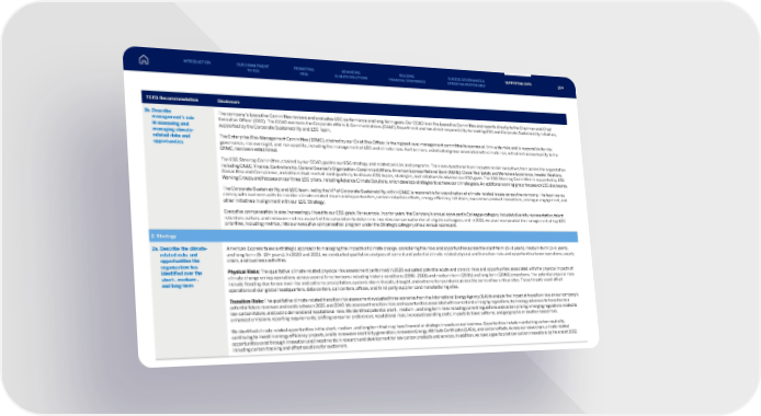 TCFD Recommendation Disclosure 1b. Describe management’s role in assessing and managing climate- related risks and opportunities The company’s Executive Committee reviews and evaluates ESG performance and long-term goals. Our CCAO is on the Executive Committee and reports directly to the Chairman and Chief Executive Officer (CEO). The CCAO oversees the Corporate Affairs & Communications (CA&C) Department and has direct responsibility for leading ESG and Corporate Sustainability initiatives, supported by the Corporate Sustainability and ESG Team. The Enterprise Risk Management Committee (ERMC), chaired by our Chief Risk Officer, is the highest-level management committee to oversee all firm-wide risks and is responsible for risk governance, risk oversight, and risk appetite, including the management of ESG and climate risks. Furthermore, a dedicated group associated with climate risk, with direct accountability to the ERMC, has been established. The ESG Steering Committee, chaired by our CCAO, guides our ESG strategy and related policies and programs. The cross-functional team includes senior executives from across the organization including CA&C, Finance, Controllership, General Counsel’s Organization, Government Affairs, American Express National Bank (AENB), Global Real Estate and Workplace Experience, Investor Relations, Global Risk and Compliance, and others that meet at least quarterly to discuss ESG topics, strategies, and initiatives to advance our ESG goals. The ESG Steering Committee is supported by ESG Working Groups and focuses on our three ESG pillars, including Advance Climate Solutions, which develops strategies to achieve our climate goals. An additional working group focuses on ESG disclosures. The Corporate Sustainability and ESG team, led by the VP of Corporate Sustainability, within CA&C is responsible for coordination of climate-related issues across the company. The team works closely with business units to monitor climate-related issues and opportunities, carbon reduction efforts, energy efficiency initiatives, low-carbon product innovations, colleague engagement, and other initiatives in alignment with our ESG Strategy. Executive compensation is also increasingly linked to our ESG goals. For example, in prior years, the Company’s annual scorecard’s Colleague category included diversity representation, talent retention, culture, and inclusion metrics as part of the calculation to determine incentive compensation for all eligible colleagues, and in 2021, we also incorporated the management of key ESG priorities, including metrics, into our executive compensation program under the Strategic category of our annual scorecard. 2. Strategy 2a. Describe the climate- related risks and opportunities the organization has identified over the short-, medium-, and long-term American Express takes a strategic approach to managing the impacts of climate change, considering the risks and opportunities across the short-term (0–3 years), medium-term (3–6 years), and long-term (6–10+ years). In 2020 and 2021, we conducted qualitative analyses of current and potential climate-related physical and transition risks and opportunities to our operations, supply chain, and business activities. Physical Risks: The qualitative climate-related physical risk assessment performed in 2020 evaluated potential acute and chronic risks and opportunities associated with the physical impacts of climate change on key operations across several time horizons including historic conditions (1990–2018) and medium-term (2035) and long-term (2060) projections. The potential physical risks include flooding due to sea level rise and extreme precipitation, cyclonic storm threats, drought, and extreme temperatures across the some of our critical sites. These threats could affect operations at our global headquarters, data centers, call centers, offices, and third-party supplier card manufacturing sites. Transition Risks: The qualitative climate-related transition risk assessment evaluated three scenarios from the International Energy Agency (IEA) to analyze the impact of transition risks on our company’s potential future revenues and costs between 2025 and 2040. We assessed transition risks and opportunities associated with current and emerging regulations, technology advances to transition to a low-carbon future, and public demand and reputational risks. We identified potential short-, medium-, and long-term risks including current regulations and carbon pricing; emerging regulations related to enhanced emissions reporting requirements; shifting consumer preferences; reputational risks; increased operating costs; impacts to travel patterns; and geographic or location-based risks. We identified climate-related opportunities in the short, medium, and long term that may have financial or strategic impacts on our business. Opportunities include maintaining carbon neutrality, continuing to invest in energy efficiency projects, onsite renewable electricity generation, renewable Energy Attribute Certificates (EACs), and carbon offsets. Across our value chain, climate-related opportunities exist through innovation and investments in research and development for low-carbon products and services. In addition, we have a goal to pilot low-carbon innovations by the end of 2022, including carbon tracking and offset solutions for customers. INTRODUCTION PROMOTING DE&I ADVANCING CLIMATE SOLUTIONS BUILDING FINANCIAL CONFIDENCE OUR ESG GOVERNANCE & OPERATING RESPONSIBLY SUPPORTING DATA OUR COMMITMENT TO ESG 104
