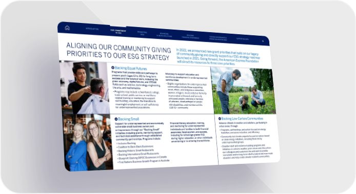ALIGNING OUR COMMUNITY GIVING PRIORITIES TO OUR ESG STRATEGY In 2022, we announced new grant priorities that build on our legacy of community giving and directly support our ESG strategy roadmap launched in 2021. Going forward, the American Express Foundation will direct its resources to three core priorities: Backing Small Support for underrepresented and economically vulnerable small business owners and entrepreneurs through our “Backing Small” initiative, including grants, mentoring support, and technical assistance through established community partnerships. Programs include: • Inclusive Backing • Coalition to Back Black Businesses • Backing Historic Small Restaurants • Backing International Small Restaurants • Blueprint: Backing BIPOC Businesses in Canada • First Nations Business Growth Program in Australia Financial literacy education, training, and mentoring for underrepresented individuals and families to build financial awareness, fiscal acumen, and success, including for school age grades 5-12, during higher education, or when individuals are entering or re-entering the workforce. Backing Low-Carbon Communities Advance climate innovation and solutions, particularly in urban areas, through: • Programs, partnerships, and action focused on energy transition, emissions reduction, and efficiency. • Community-led climate projects focused on nature-based or clean energy initiatives, including those led by underrepresented groups. • Disaster relief and resilience building programs and initiatives in extreme weather prone areas and cities where our colleagues and customers live and work to provide immediate and/or long-term relief to natural and man-made disasters and help create climate-resilient communities. Backing Equal Futures Programs that provide skills and pathways to prepare youth (ages 13 to 30) for long-term success and the future of work, including the green economy, digital futures, and STEAM fields such as science, technology, engineering, the arts, and mathematics: • Programs may include school-based, college, trade school, public service, or workforce- related training or mentoring to support skill building, education, the transition to meaningful employment, or self-sufficiency for underrepresented populations. Advocacy to support education and workforce development in underrepresented communities: • Eligible organizations for underrepresented communities include those supporting racial, ethnic, and Indigenous minorities, women, refugees, incarcerated or formerly incarcerated, unhoused and formerly unhoused people, veterans or families of veterans, disadvantaged or people with disabilities, and members of the LGBTQ+ community. 11 INTRODUCTION PROMOTING DE&I ADVANCING CLIMATE SOLUTIONS BUILDING FINANCIAL CONFIDENCE OUR ESG GOVERNANCE & OPERATING RESPONSIBLY SUPPORTING DATA OUR COMMITMENT TO ESG