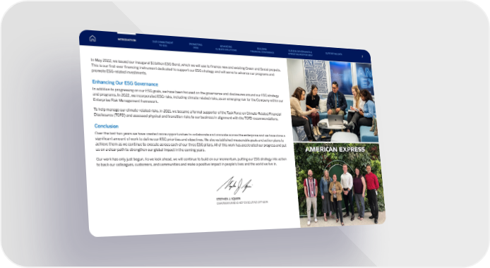 In May 2022, we issued our inaugural $1 billion ESG Bond, which we will use to finance new and existing Green and Social projects. This is our first-ever financing instrument dedicated to support our ESG strategy and will serve to advance our programs and promote ESG-related investments. Enhancing Our ESG Governance In addition to progressing on our ESG goals, we have been focused on the governance and disclosures around our ESG strategy and programs. In 2022, we incorporated ESG risks, including climate-related risks, as an emerging risk for the Company within our Enterprise Risk Management framework. To help manage our climate-related risks, in 2021, we became a formal supporter of the Task Force on Climate-Related Financial Disclosures (TCFD) and assessed physical and transition risks to our business in alignment with the TCFD recommendations. Conclusion Over the last two years we have created more opportunities to collaborate and innovate across the enterprise and we have done a significant amount of work to define our ESG priorities and objectives. We also established measurable goals and action plans to achieve them as we continue to execute across each of our three ESG pillars. All of this work has accelerated our progress and put us on a clear path to strengthen our global impact in the coming years. Our work has only just begun. As we look ahead, we will continue to build on our momentum, putting our ESG strategy into action to back our colleagues, customers, and communities and make a positive impact in people’s lives and the world we live in. STEPHEN J. SQUERI CHAIRMAN AND CHIEF EXECUTIVE OFFICER INTRODUCTION PROMOTING DE&I ADVANCING CLIMATE SOLUTIONS BUILDING FINANCIAL CONFIDENCE OUR ESG GOVERNANCE & OPERATING RESPONSIBLY SUPPORTING DATA OUR COMMITMENT TO ESG 7