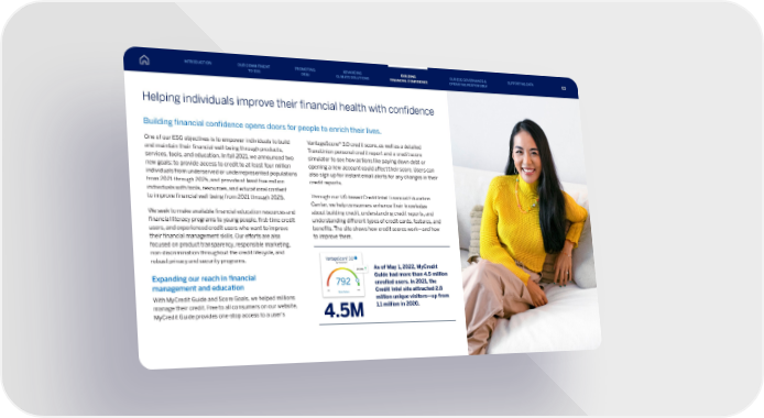 Helping individuals improve their financial health with confidence Building financial confidence opens doors for people to enrich their lives. One of our ESG objectives is to empower individuals to build and maintain their financial well-being through products, services, tools, and education. In fall 2021, we announced two new goals: to provide access to credit to at least four million individuals from underserved or underrepresented populations from 2021 through 2025, and provide at least five million individuals with tools, resources, and educational content to improve financial well-being from 2021 through 2025. We seek to make available financial education resources and financial literacy programs to young people, first-time credit users, and experienced credit users who want to improve their financial management skills. Our efforts are also focused on product transparency, responsible marketing, non-discrimination throughout the credit lifecycle, and robust privacy and security programs. Expanding our reach in financial management and education With MyCredit Guide and Score Goals, we helped millions manage their credit. Free to all consumers on our website, MyCredit Guide provides one-stop access to a user’s VantageScore® 3.0 credit score, as well as a detailed TransUnion personal credit report and a credit score simulator to see how actions like paying down debt or opening a new account could affect their score. Users can also sign up for instant email alerts for any changes in their credit reports. Through our US-based Credit Intel Financial Education Center, we help consumers enhance their knowledge about building credit, understanding credit reports, and understanding different types of credit cards, features, and benefits. The site shows how credit scores work—and how to improve them. 4.5M As of May 1, 2022, MyCredit Guide had more than 4.5 million enrolled users. In 2021, the Credit Intel site attracted 2.8 million unique visitors—up from 1.1 million in 2020. INTRODUCTION PROMOTING DE&I ADVANCING CLIMATE SOLUTIONS BUILDING FINANCIAL CONFIDENCE OUR ESG GOVERNANCE & OPERATING RESPONSIBLY SUPPORTING DATA OUR COMMITMENT TO ESG 65