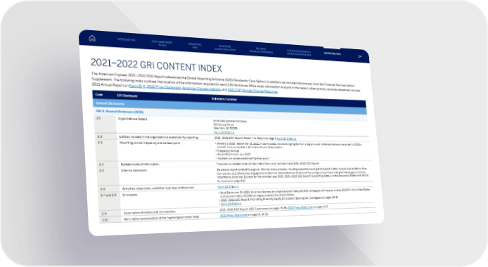 2021–2022 GRI CONTENT INDEX The American Express 2021–2022 ESG Report references the Global Reporting Initiative (GRI) Standards: Core Option. In addition, we included disclosures from the Financial Services Sector Supplement. The following index outlines the location of the information required for each GRI disclosure. While most information is found in this report, other primary sources referenced include: 2021 Annual Report on Form 10-K , 2022 Proxy Statement , American Express website , and 2021 CDP Climate Change Response . Code GRI Disclosure Reference/Location General Disclosures GRI 2: General Disclosures (2021) 2-1 Organizational Details American Express Company 200 Vesey Street New York, NY 10285 Form 10-K Item 1 2-2 Entities included in the organization’s sustainability reporting 2021–2022 ESG Report: About This Report on page 3, Form 10-K Item 1 2-3 Reporting period, frequency and contact point • January 1, 2021–December 31, 2022. In some cases, we share highlights from programs and initiatives that were launched in 2022 to provide more up-to-date information to our stakeholders. • Frequency: Annual • Report Published: July 2022 • Contact: corporate.sustainability@aexp.com 2-4 Restatements of information There are no restatements of information from prior periods in the 2021–2022 ESG Report. 2-5 External assurance We assure report content through an internal review process, including executive oversight of subject matter reviews and validation. Apex Companies, LLC (Apex) was engaged to conduct an independent verification of the energy consumption and greenhouse gas emissions reported by American Express for the calendar year 2021. 2021–2022 ESG Report: Supporting Data: Limited Assurance Statement of GHG Emissions on page 100. 2-6 Activities, value chain, and other business relationships Form 10-K Item 1 2-7 and 2-8 Employees • As of December 31, 2021, American Express employed approximately 64,000 colleagues, with approximately 22,000 in the United States and approximately 42,000 colleagues outside the United States • 2021–2022 ESG Report: Promoting Diversity, Equity & Inclusion: Backing Our Colleagues on pages 24-31 • Form 10-K Item 1 2-9 Governance structure and composition 2021–2022 ESG Report: ESG Governance on pages 76-88, 2022 Proxy Statement on pages 4-27 2-10 Nomination and selection of the highest governance body 2022 Proxy Statement on pages 4, 14-20 INTRODUCTION PROMOTING DE&I ADVANCING CLIMATE SOLUTIONS BUILDING FINANCIAL CONFIDENCE OUR ESG GOVERNANCE & OPERATING RESPONSIBLY SUPPORTING DATA OUR COMMITMENT TO ESG 114
