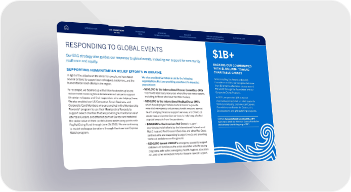 RESPONDING TO GLOBAL EVENTS Our ESG strategy also guides our response to global events, including our support for community resilience and equity. SUPPORTING HUMANITARIAN RELIEF EFFORTS IN UKRAINE In light of the attacks on the Ukrainian people, we have taken several actions to support our colleagues, customers, and the humanitarian relief efforts in the region. For example, we teamed up with Hilton to donate up to one million hotel room nights in hotels across Europe to support Ukrainian refugees and first responders who are helping them. We also enabled our US Consumer, Small Business, and Corporate Card Members who are enrolled in the Membership Rewards® program to use their Membership Rewards to support select charities that are providing humanitarian relief efforts in Ukraine and affected parts of Europe and matched the dollar value of their contributions made using points with PayPal Giving Fund through June 15, 2022. We are continuing to match colleague donations through the American Express Match program. We also provided $1 million in aid to the following organizations that are providing assistance to impacted populations: • $250,000 to the International Rescue Committee (IRC) to provide necessary resources where they are needed most, including to those who have fled their homes. • $250,000 to the International Medical Corps (IMC), which has deployed mobile medical teams to provide essential emergency and primary health services, mental health and psychosocial support services, and COVID-19 awareness and prevention services to help keep affected populations safe from the pandemic. • $250,000 to the American Red Cross to support coordinated relief efforts by the International Federation of Red Cross and Red Crescent Societies and other Red Cross partners who are responding to urgent needs and providing technical assistance on the ground. • $250,000 toward UNICEF’s emergency appeal to support children and families as the crisis escalates with life-saving programs, safe water, emergency health, hygiene, education aid, and other immediate help for those in need of support. BACKING OUR COMMUNITIES WITH $1 BILLION+ TOWARD CHARITABLE CAUSES Since creating the American Express Foundation in 1954, we have provided more than $1 billion to charitable causes around the world through the Foundation and our Corporate Giving Program. In 2021, we provided $38 million in charitable giving globally, including grants from our company, the American Express Foundation, our Center for Community Development, and gift-matching programs. See our 2021 Community Giving Grants List to learn more about our American Express Foundation and company charitable giving in 2021. $1B+ 13 INTRODUCTION PROMOTING DE&I ADVANCING CLIMATE SOLUTIONS BUILDING FINANCIAL CONFIDENCE OUR ESG GOVERNANCE & OPERATING RESPONSIBLY SUPPORTING DATA OUR COMMITMENT TO ESG