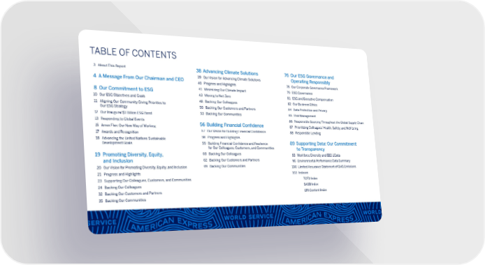 TABLE OF CONTENTS 3 About This Report 4 A Message From Our Chairman and CEO 8 Our Commitment to ESG 10 Our ESG Objectives and Goals 1 1 Aligning Our Community Giving Priorities to Our ESG Strategy 12 Our Inaugural $1 Billion ESG Bond 13 Responding to Global Events 15 Amex Flex: Our New Way of Working 17 Awards and Recognition 18 Advancing the United Nations Sustainable Development Goals 19 Promoting Diversity, Equity, and Inclusion 20 Our Vision for Promoting Diversity, Equity, and Inclusion 2 1 Progress and Highlights 23 Supporting Our Colleagues, Customers, and Communities 24 Backing Our Colleagues 32 Backing Our Customers and Partners 35 Backing Our Communities 38 Advancing Climate Solutions 39 Our Vision for Advancing Climate Solutions 40 Progress and Highlights 41 Minimizing Our Climate Impact 43 Moving to Net-Zero 48 Backing Our Colleagues 50 Backing Our Customers and Partners 53 Backing Our Communities 56 Building Financial Confidence 57 Our Vision for Building Financial Confidence 58 Progress and Highlights 59 Building Financial Confidence and Resilience for Our Colleagues, Customers, and Communities 60 Backing Our Colleagues 62 Backing Our Customers and Partners 69 Backing Our Communities 76 Our ESG Governance and Operating Responsibly 78 Our Corporate Governance Framework 79 ESG Governance 81 ESG and Executive Compensation 82 Our Business Ethics 84 Data Protection and Privacy 85 Risk Management 86 Responsible Sourcing Throughout the Global Supply Chain 87 Prioritizing Colleagues’ Health, Safety, and Well-being 88 Responsible Lending 89 Supporting Data: Our Commitment to Transparency 93 Workforce Diversity and EEO-1 Data 96 Environmental Performance Data Summary 100 Limited Assurance Statement of GHG Emissions 103 Indexes TCFD Index SASB Index GRI Content Index