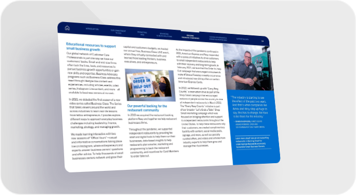 Educational resources to support small business growth Our global network of Customer Care Professionals is just one way we have our customers’ backs. Small and mid-size firms often lack the time, tools, and resources to pursue business growth opportunities or gain new skills and expertise. Business Advocacy programs such as Business Class address this need through lifestyle-like content and experiences, including articles, events, video series, Instagram Live content, and more—all available to business owners at no cost. In 2021, we debuted the first season of a new video series called Business Class: The Series that takes viewers around the world and across industries to learn real-life lessons from fellow entrepreneurs. Episodes explore different ways to approach everyday business challenges including leadership, finance, marketing, strategy, and managing growth. We made learning interactive with two new seasons of “Office Hours”—casual and informative conversations taking place live on Instagram, where entrepreneurs and experts answer business owners’ questions and offer advice. To help thousands of small businesses owners network and grow their capital and customers budgets, we hosted our annual free, Business Class LIVE event, where they virtually connected with and learned from leading thinkers, business executives, and entrepreneurs. Our powerful backing for the restaurant community In 2019 we acquired the restaurant booking platform Resy and together we help restaurant businesses thrive. Throughout the pandemic, we supported independent restaurants by providing fee relief and digital tools to help them run their businesses, data-based insights to help restaurants plan smarter, marketing and programming to back the restaurant community, and incentives for Card Members to order take out. As the impacts of the pandemic continued in 2021, American Express and Resy responded with a series of initiatives to drive customers to small independent restaurants to help with their recovery and long-term growth. In February 2021, we launched the Order In, Help Out campaign that encouraged consumers to make #TakeoutTuesday a weekly occurrence and introduced new dining offers on certain American Express Cards. In 2022, we followed up with “Every Resy Counts,” a reservation drive as part of the Shop Small campaign that encouraged millions of people across the country to dine at independent restaurants in March 2022. The “Every Resy Counts” initiative is part of our broader “Let’s Grab a Table” Shop Small marketing campaign which was focused on bringing attention and support to independent restaurants throughout the United States. To help these restaurants rally their customers, we created complimentary toolkits with content, social media posts, signage, and more, as well as specially curated offers, and videos and articles from industry experts to help them grow and manage their businesses. “ The industry is starting to see the effect of the past two years. And that’s when companies like Amex and Resy step up huge to say, this has to change. We have to be there for the industry.” – CHRIS SHEPHERD, JAMES BEARD AWARD-WINNING CHEF AND CO-FOUNDER OF SOUTHERN SMOKE Learn more about how we are supporting restaurants in Backing Small for Underrepresented and Economically Vulnerable Small Business Owners. INTRODUCTION PROMOTING DE&I ADVANCING CLIMATE SOLUTIONS BUILDING FINANCIAL CONFIDENCE OUR ESG GOVERNANCE & OPERATING RESPONSIBLY SUPPORTING DATA OUR COMMITMENT TO ESG 64