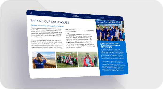 BACKING OUR COLLEAGUES Engaging our colleagues through Green2Gether Engaging our colleagues in sustainability initiatives through the Green2Gether program is an important goal of our ESG strategy, and we engage thousands of our colleagues during the year, offering workplace climate education, waste and energy reduction efforts, and volunteer opportunities with non-profit partners. Volunteer-led Green2Gether activities range from beach cleanups to recycling drives to innovative virtual Earth Day campaigns during the COVID-19 pandemic. Every April during Earth Month, colleagues around the world can participate in dozens of company-sponsored activities, such as recycling drives, online lectures, community clean-ups, and sustainability awareness campaigns. In 2021, we engaged colleagues virtually to support the planting of 100,000 trees in partnership with The Nature Conservancy’s Plant a Billion Trees campaign, funding approximately 210,000 trees in total since 2017. In 2022, colleagues have engaged in environmentally-focused in-person and/or virtual volunteer activities and events with The Central Park Conservancy, United Way of Salt Lake City, South Downs National Park (UK), PRIDE+ Network, Compass Group, Catchafire, and others. CONNECTING OUR COLLEAGUES TO CLIMATE SOLUTIONS AND THE GREAT OUTDOORS The National Park Foundation’s Service Corps programs support essential preservation projects in national parks across the US. Through a new multi- year partnership, we’re providing a total of $1 million in funding over the next three years to support the Service Corps program, building on over $5.7 million in funding to the National Park Foundation since 2015. In partnership with the Ocean Conservancy and International Coastal Cleanup, American Express colleagues collected approximately 24,000 pounds of marine debris globally from 2018 to 2022. Colleagues participated in beach cleanups and other initiatives across seven countries, including Australia, Italy, Japan, Malaysia, the Philippines, Spain, and the US. INTRODUCTION PROMOTING DE&I ADVANCING CLIMATE SOLUTIONS BUILDING FINANCIAL CONFIDENCE OUR ESG GOVERNANCE & OPERATING RESPONSIBLY SUPPORTING DATA OUR COMMITMENT TO ESG 48