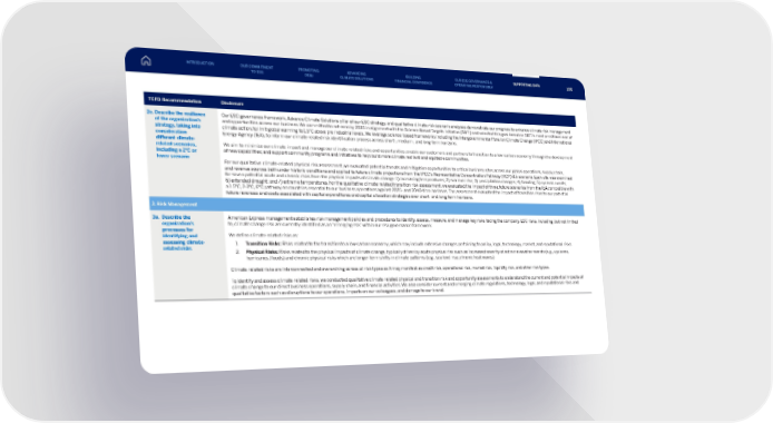 TCFD Recommendation Disclosure 2c. Describe the resilience of the organization’s strategy, taking into consideration different climate- related scenarios, including a 2°C or lower scenario Our ESG governance framework, Advance Climate Solutions pillar of our ESG strategy, and qualitative climate risk scenario analyses demonstrate our progress to enhance climate risk management and opportunities across our business. We committed to net-zero by 2035 in alignment with the Science Based Targets initiative (SBTi) and selected this goal based on SBTi’s most ambitious level of climate action, to limit global warming to 1.5°C above pre-industrial levels. We leverage science-based frameworks including the Intergovernmental Panel on Climate Change (IPCC) and International Energy Agency (IEA), to inform our climate-related risk identification process across short-, medium-, and long-term horizons. We aim to minimize our climate impact and manage our climate-related risks and opportunities; enable our customers and partners to transition to a low-carbon economy through the development of new capabilities; and support community programs and initiatives to help build more climate resilient and equitable communities. For our qualitative climate-related physical risk assessment, we evaluated potential threats and mitigation opportunities to critical business sites across our global operations, supply chain, and revenue sources both under historic conditions and applied to future climate projections from the IPCC’s Representative Concentration Pathway (RCP) 8.5 scenario. Each site was examined for seven potential acute and chronic risks from the physical impacts of climate change: 1) increasing temperatures; 2) sea level rise; 3) precipitation changes; 4) flooding; 5) cyclonic events; 6) extended drought; and 7) extreme temperatures. For the qualitative climate-related transition risk assessment, we evaluated the impact of three future scenarios from the IEA compatible with a 1.5°C, 2-3°C, 6°C pathway on countries essential to our business operations against 2025- and 2040-time horizons. The assessment evaluated the impact of transition risks to our potential future revenues and costs associated with capital expenditures and capital allocation strategies over short- and long-term horizons. 3. Risk Management 3a. Describe the organization’s processes for identifying and assessing climate- related risks American Express management establishes risk management policies and procedures to identify, assess, measure, and manage key risks facing the company. ESG risks, including, but not limited to, climate change risk are currently identified as an “emerging risk” within our risk governance framework. We define climate-related risks as: 1. Transition Risks: Risks related to the transition to a low-carbon economy, which may include extensive changes pertaining to policy, legal, technology, market, and reputational risks 2. Physical Risks: Risks related to the physical impacts of climate change, typically driven by acute physical risk such as increased severity of extreme weather events (e.g., cyclones, hurricanes, floods) and chronic physical risks which are longer-term shifts in climate patterns (e.g., sea level rise, chronic heat waves) Climate-related risks are interconnected and overarching across all risk types as it may manifest as credit risk, operational risk, market risk, liquidity risk, and other risk types. To identify and assess climate-related risks, we conducted qualitative climate-related physical and transition risk and opportunity assessments to understand the current and potential impacts of climate change to our direct business operations, supply chain, and financial activities. We also consider current and emerging climate regulations, technology, legal, and reputational risks and qualitative factors such as disruptions to our operations, impacts on our colleagues, and damage to our brand. INTRODUCTION PROMOTING DE&I ADVANCING CLIMATE SOLUTIONS BUILDING FINANCIAL CONFIDENCE OUR ESG GOVERNANCE & OPERATING RESPONSIBLY SUPPORTING DATA OUR COMMITMENT TO ESG 106