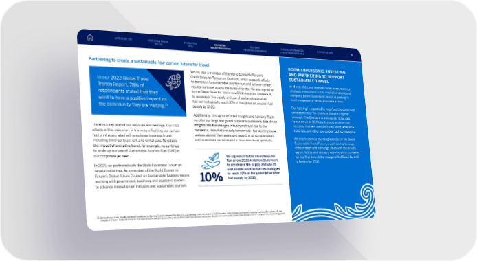 Partnering to create a sustainable, low-carbon future for travel Travel is a key part of our services and heritage. Our ESG efforts in this area start at home by offsetting our carbon footprint associated with employee business travel— including third-party air, rail, and rental cars. To reduce the impact of executive travel, for example, we continue to scale up our use of Sustainable Aviation Fuel (SAF) in our corporate jet fleet. In 2021, we partnered with the World Economic Forum on several initiatives. As a member of the World Economic Forum’s Global Future Council on Sustainable Tourism, we are working with government, business, and academic leaders to advance innovation on inclusive and sustainable tourism. We are also a member of the World Economic Forum’s Clean Skies for Tomorrow Coalition, which supports efforts to transition to sustainable aviation fuel and achieve carbon neutral air travel across the aviation sector. We also signed on to the Clean Skies for Tomorrow 2030 Ambition Statement, to accelerate the supply and use of sustainable aviation fuel technologies to reach 10% of the global jet aviation fuel supply by 2030. Additionally, through our Global Insights and Advisory Team, we offer our large and global corporate customers data-driven insights into the changes in business travel due to the pandemic, data that can help benchmark their existing travel polices against their peers and reporting on considerations on the environmental impact of business travel generally. BOOM SUPERSONIC: INVESTING AND PARTNERING TO SUPPORT SUSTAINABLE TRAVEL In March 2021, our Ventures team announced our strategic investment in this innovative aerospace company Boom Supersonic, which is seeking to build a supersonic and sustainable airliner. Our backing is expected to help fund the continued development of the Overture, Boom’s flagship product. The Overture is anticipated to be able to run on up to 100% sustainable aviation fuel, including biofuels manufactured using renewable materials, and other low-carbon fuel technologies. We also became a founding member of the Boom Sustainable Travel Forum, a partnership to forge relationships and exchange ideas with the private sector, NGOs, and industry experts, which convened for the first time at the inaugural Net Good Summit in November 2021. 21. Methodology: Amex Trendex online poll conducted by Morning Consult between February 3-11, 2022 among a national sample of 2,000 travelers in the US and 1,000 travelers in Japan, Australia, Mexico, India, UK, and Canada who have a household income of at least $70,000 and defined as adults who typically travel by air at least once a year. Results from each country survey have a margin of error of plus or minus 3 percentage points. In our 2022 Global Travel Trends Report, 78% of respondents stated that they want to have a positive impact on the community they are visiting. 21 We signed on to the Clean Skies for Tomorrow 2030 Ambition Statement, to accelerate the supply and use of sustainable aviation fuel technologies to reach 10% of the global jet aviation fuel supply by 2030. 10% INTRODUCTION PROMOTING DE&I ADVANCING CLIMATE SOLUTIONS BUILDING FINANCIAL CONFIDENCE OUR ESG GOVERNANCE & OPERATING RESPONSIBLY SUPPORTING DATA OUR COMMITMENT TO ESG 52