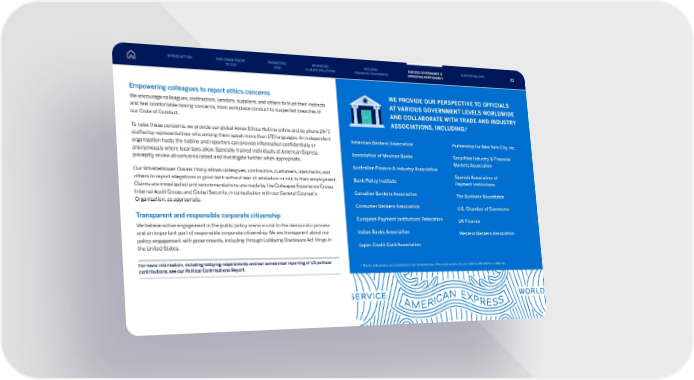 WE PROVIDE OUR PERSPECTIVE TO OFFICIALS AT VARIOUS GOVERNMENT LEVELS WORLDWIDE AND COLLABORATE WITH TRADE AND INDUSTRY ASSOCIATIONS, INCLUDING: 1 Empowering colleagues to report ethics concerns We encourage colleagues, contractors, vendors, suppliers, and others to trust their instincts and feel comfortable raising concerns, from workplace conduct to suspected breaches of our Code of Conduct. To raise these concerns, we provide our global Amex Ethics Hotline online and by phone 24/7, staffed by representatives who among them speak more than 170 languages. An independent organization hosts the hotline and reporters can provide information confidentially or anonymously where local laws allow. Specially trained individuals at American Express promptly review all concerns raised and investigate further when appropriate. Our Whistleblower Claims Policy allows colleagues, contractors, customers, merchants, and others to report allegations in good faith without fear of retaliation or risk to their employment. Claims are investigated and recommendations are made by the Colleague Experience Group, Internal Audit Group, and Global Security, in consultation with our General Counsel’s Organization, as appropriate. Transparent and responsible corporate citizenship We believe active engagement in the public policy arena is vital to the democratic process and an important part of responsible corporate citizenship. We are transparent about our policy engagement with governments, including through Lobbying Disclosure Act filings in the United States. For more information, including lobbying requirements and our semiannual reporting of US political contributions, see our Political Contributions Report. American Bankers Association Association of Mexican Banks Australian Finance & Industry Association Bank Policy Institute Canadian Bankers Association Consumer Bankers Association European Payment Institutions Federation Indian Banks Association Japan Credit Card Association Partnership for New York City, Inc. Securities Industry & Financial Markets Association Spanish Association of Payment Institutions The Business Roundtable U.S. Chamber of Commerce UK Finance Western Bankers Association 1. This list is illustrative, and not intended to be comprehensive of the trade and industry associations with which we collaborate. INTRODUCTION PROMOTING DE&I ADVANCING CLIMATE SOLUTIONS BUILDING FINANCIAL CONFIDENCE OUR ESG GOVERNANCE & OPERATING RESPONSIBLY SUPPORTING DATA OUR COMMITMENT TO ESG 83 83