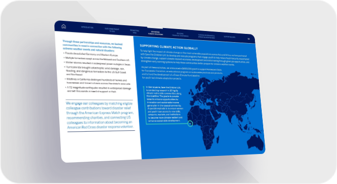 Through these partnerships and resources, we backed communities in need in connection with the following extreme weather events and natural disasters: • Floods devastated Germany and Western Europe • Multiple tornadoes swept across the Midwest and Southern US • Winter storms resulted in widespread power outages in Texas • Hurricane Ida brought catastrophic wind damage, rain, flooding, and dangerous tornadoes to the US Gulf Coast and Northeast • Wildfires in California destroyed hundreds of homes and businesses and forced citizens across the state to evacuate • A 7.2 magnitude earthquake resulted in widespread damage and left thousands in need of support in Haiti We engage our colleagues by matching eligible colleague contributions toward disaster relief through the American Express Match program, recommending charities, and connecting US colleagues to information about becoming an American Red Cross disaster response volunteer. In Sierra Leone, Save the Children U.K. is conducting research in 20 highly climate-vulnerable communities along the coastline. The goal is to provide ideas to enhance opportunities for innovation and sustainable income generation in the coastal community. A special emphasis is to ensure women and youth have access to new skills, networks, markets, and institutions to become more climate-resilient and enhance sustainable development. SUPPORTING CLIMATE ACTION GLOBALLY To help fight the impact of climate change on the most vulnerable populations across Asia and Africa, we have partnered with Save the Children U.K. to develop and execute programs that engage youth to help reduce food insecurity exacerbated by climate change, support climate-resilient economic development and skills training through green job opportunities, and strengthen early warning systems to help these communities better prepare for extreme weather events. As part of these activities, we announced a $600,000 grant to support Adolescent Skills for Successful Transition, an educational program on sustainable practices and products, and to fund the development of a Green Climate Fund pipeline for youth-led climate adaptation projects. INTRODUCTION PROMOTING DE&I ADVANCING CLIMATE SOLUTIONS BUILDING FINANCIAL CONFIDENCE OUR ESG GOVERNANCE & OPERATING RESPONSIBLY SUPPORTING DATA OUR COMMITMENT TO ESG 55
