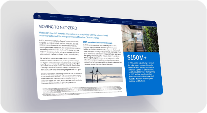In 2019, we set a goal to have 60% of the total square footage of leased or owned facilities actively occupied by American Express be green building certified by 2025. Since the beginning of 2019, we have spent more than $150 million on the development of facilities that have received green building certifications. MOVING TO NET-ZERO We support the shift toward a low-carbon economy, in line with the science-based recommendations of the Intergovernmental Panel on Climate Change. In 2021, we maintained CarbonNeutral® certification across our global operations, including offices, field sites, and data centers, in accordance with the CarbonNeutral Protocol, a leading third-party framework, and our operations remained powered by 100% renewable electricity. 6 Following on these steps, we have committed to net-zero emissions by 2035 in alignment with the Science-Based Targets initiative (SBTi). 7 We made this commitment based on the SBTi’s most ambitious level of climate action, to limit global warming to 1.5 degrees Celsius above pre-industrial levels. In signing on to the Business Ambition for 1.5°C and the UN Race to Zero Campaign, American Express is among a growing roster of more than 1,400 companies setting targets to the 1.5°C goal. Since our operations are already carbon neutral, we will focus on our supply chain and work with our vendors, encouraging them to establish their own science-based emissions reduction targets and track, reduce, and eventually neutralize their operational greenhouse gas (GHG) emissions. 2025 operational environmental goals In 2019, we set operational environmental goals for 2025 that cover energy and water use, waste generation, green building certifications, the phaseout of single-use plastics, and responsible paper sourcing; in 2021, we made progress on these goals. However, our reductions in energy, waste, and water were also greatly impacted by office closures due to the pandemic and we expect usage to increase as colleagues return to the office. While progress toward our operational environmental goals will not be linear, we expect to continue to make important advances to meet them over the next few years. 6. Operations include all our managed facilities, field sites, and data centers. Managed facilities are individual properties operationally managed by our global real estate team and housing critical business functions. Field sites are individual properties that are not operationally managed by our global real estate team but directly by our business units. They are typically smaller sites, less than 30,000 square feet (including airport lounges, foreign exchange kiosks, and sales offices), that are owned or leased by American Express. The company’s goal to remain carbon neutral covers Scope 1 (direct emissions from sources owned or controlled by American Express), Scope 2 (indirect location-based and market-based emissions), Scope 3 emissions (Category 5 waste generated in operations and Category 6 business travel) through renewable energy credits, carbon offsets, and reduced GHG emissions. 7. American Express is following the methodology of the SBTi for our commitment to net-zero by 2035, which covers all Scope 1 and 2 emissions and a minimum of two-thirds of total Scope 3 emissions in conformance with the GHG Protocol Corporate Value Chain (Scope 3) Accounting and Reporting Standard. $150M+ INTRODUCTION PROMOTING DE&I ADVANCING CLIMATE SOLUTIONS BUILDING FINANCIAL CONFIDENCE OUR ESG GOVERNANCE & OPERATING RESPONSIBLY SUPPORTING DATA OUR COMMITMENT TO ESG 43