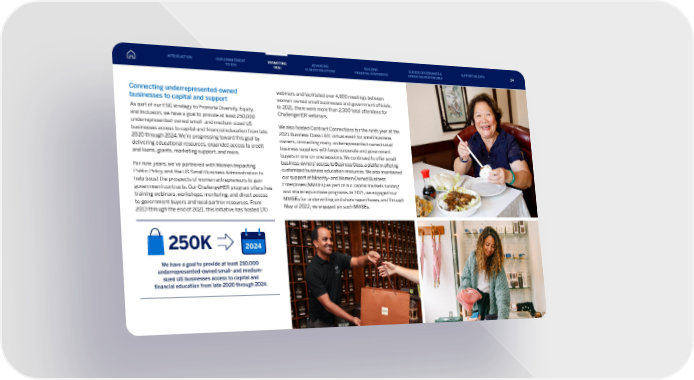 Connecting underrepresented-owned businesses to capital and support As part of our ESG strategy to Promote Diversity, Equity, and Inclusion, we have a goal to provide at least 250,000 underrepresented-owned small- and medium-sized US businesses access to capital and financial education from late 2020 through 2024. We’re progressing toward this goal by delivering educational resources, expanded access to credit and loans, grants, marketing support, and more. For nine years, we’ve partnered with Women Impacting Public Policy and the US Small Business Administration to help boost the prospects of women entrepreneurs to gain government contracts. Our ChallengeHER program offers free training webinars, workshops, mentoring, and direct access to government buyers and local partner resources. From 2013 through the end of 2021, this initiative has hosted 170 webinars and facilitated over 4,800 meetings between women-owned small businesses and government officials. In 2021, there were more than 2,300 total attendees for ChallengeHER webinars. We also hosted Contract Connections for the ninth year at the 2021 Business Class LIVE virtual event for small business owners, connecting many underrepresented-owned small business suppliers with large corporate and government buyers in one-on-one sessions. We continued to offer small business owners’ access to Business Class, a platform offering customized business education resources. We also maintained our support of Minority- and Women-Owned Business Enterprises (MWBEs) as part of our capital markets funding and share repurchase programs. In 2021, we engaged four MWBEs for underwriting and share repurchases, and through May of 2022, we engaged six such MWBEs. We have a goal to provide at least 250,000 underrepresented-owned small- and medium- sized US businesses access to capital and financial education from late 2020 through 2024. 2024 250K INTRODUCTION PROMOTING DE&I ADVANCING CLIMATE SOLUTIONS BUILDING FINANCIAL CONFIDENCE OUR ESG GOVERNANCE & OPERATING RESPONSIBLY SUPPORTING DATA OUR COMMITMENT TO ESG 34