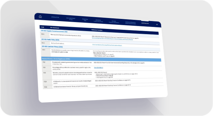 Code GRI Disclosure Reference/Location GRI 414: Supplier Social Assessments 2016 414-1 New suppliers that were screened using social criteria 2021–2022 ESG Report: Responsible Sourcing Throughout the Global Supply Chain on page 86, American Express Commitment to Supplier Diversity, Equity, and Inclusion Website GRI 415: Public Policy (2016) 415-1 Political Contributions American Express Company Political Contributions Report GRI 418: Customer Privacy (2016) 418-1 Substantiated complaints concerning breaches of customer privacy and losses of customer data American Express does not report a metric on the bases specified in the standard. Learn more about our customer privacy practices in our 2021–2022 ESG Report: • Protecting Our Customers on page 67 • Data Protection and Privacy on page 84 Financial Services Sector Supplement (2008) FS2 Procedures for assessing and screening environmental and social risks in business lines 2021-2022 ESG Report: Our ESG Governance and Operating Responsibly: Risk Management on page 85 FS6 Percentage of the portfolio for business lines by specific region, size, and by sector Form 10-K Item 1 FS8 Monetary value of products and services designed to deliver a specific environmental benefit for each business line broken down by purpose 2021–2022 ESG Report: • Advancing Climate Solutions: Backing Our Customers and Partners on pages 50-52 • Responsible Lending on page 88 • Investing Activities on pages 88 FS14 Initiatives to improve access to financial services for disadvantaged people 2021–2022 ESG Report: Building Financial Confidence on pages 56-75 FS16 Initiatives to enhance financial literacy by type of beneficiary 2021–2022 ESG Report: Building Financial Confidence on pages 56-75 INTRODUCTION PROMOTING DE&I ADVANCING CLIMATE SOLUTIONS BUILDING FINANCIAL CONFIDENCE OUR ESG GOVERNANCE & OPERATING RESPONSIBLY SUPPORTING DATA OUR COMMITMENT TO ESG 120