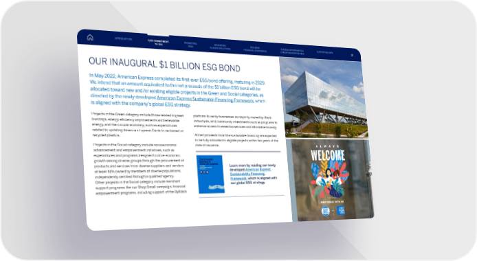 OUR INAUGURAL $1 BILLION ESG BOND In May 2022, American Express completed its first-ever ESG bond offering, maturing in 2029. We intend that an amount equivalent to the net proceeds of the $1 billion ESG bond will be allocated toward new and/or existing eligible projects in the Green and Social categories, as directed by the newly developed American Express Sustainable Financing Framework , which is aligned with the company’s global ESG strategy. Projects in the Green category include those related to green buildings, energy efficiency improvements and renewable energy, and the circular economy, such as expenditures related to updating American Express Cards to reclaimed or recycled plastics. Projects in the Social category include socioeconomic advancement and empowerment initiatives, such as expenditures and programs designed to drive economic growth among diverse groups through the procurement of products and services from diverse suppliers and vendors at least 51% owned by members of diverse populations, independently certified through a qualified agency. Other projects in the Social category include merchant support programs like our Shop Small campaign, financial empowerment programs, including support of the ByBlack platform to verify businesses as majority-owned by Black individuals, and community investments such as programs to enhance access to essential services and affordable housing. All net proceeds from the sustainable financing are expected to be fully allocated to eligible projects within two years of the date of issuance. Part I Introduction Part II Sustainable Financing Framework Part III Appendix Part IV Disclaimers The Powerful Backing of American Express April 2022 Sustainability Financing Framework Learn more by reading our newly developed American Express Sustainability Financing Framework , which is aligned with our global ESG strategy. 12 INTRODUCTION PROMOTING DE&I ADVANCING CLIMATE SOLUTIONS BUILDING FINANCIAL CONFIDENCE OUR ESG GOVERNANCE & OPERATING RESPONSIBLY SUPPORTING DATA OUR COMMITMENT TO ESG