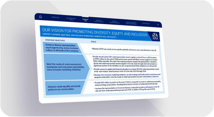 STRATEGIC OBJECTIVES GOALS • Provide $50 million in grants by the end of 2024 to nonprofits focused on addressing inequality and promoting social justice, including those led by members of underrepresented groups • Increase the representation of American Express Leadership Academy participants in the US who are from underrepresented groups from 50% in 2019 to 75% by the end of 2024 • Double annual spend with underrepresented-owned suppliers in the US from a 2019 baseline to $750 million by the end of 2024 and increase spend with Black-owned suppliers to at least $100 million annually. We expect the ongoing progress towards this goal and the cumulative spend with underrepresented-owned suppliers from late 2020 through 2025 will comprise a significant portion of the $4 billion we aim to spend toward DE&I initiatives over this period. • Provide access to capital and financial education to at least 250,000 underrepresented-owned small- and medium-sized business in the US from late 2020 through 2024 • Develop more inclusive marketing initiatives, as well as design and build product experiences and programs that better meet the needs of underrepresented consumer and business customers • Maintain 100% pay equity across genders globally and across races and ethnicities in the US Enhance diverse representation, equal opportunity, and an inclusive culture at all levels of the company Meet the needs of underrepresented businesses and consumers and develop more inclusive marketing initiatives Advance racial equality and social justice in our communities OUR VISION FOR PROMOTING DIVERSITY, EQUITY, AND INCLUSION SUPPORT A DIVERSE, EQUITABLE, AND INCLUSIVE WORKFORCE, MARKETPLACE, AND SOCIETY INTRODUCTION PROMOTING DE&I ADVANCING CLIMATE SOLUTIONS BUILDING FINANCIAL CONFIDENCE OUR ESG GOVERNANCE & OPERATING RESPONSIBLY SUPPORTING DATA OUR COMMITMENT TO ESG 20