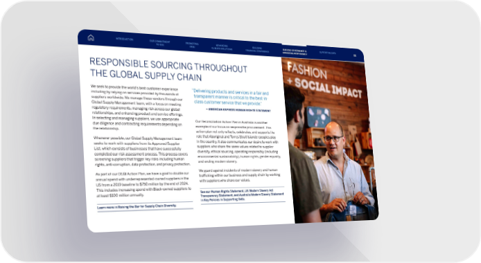 RESPONSIBLE SOURCING THROUGHOUT THE GLOBAL SUPPLY CHAIN We seek to provide the world’s best customer experience including by relying on services provided by thousands of suppliers worldwide. We manage these vendors through our Global Supply Management team, with a focus on meeting regulatory requirements, managing risk across our global relationships, and enhancing product and service offerings. In selecting and managing suppliers, we use appropriate due diligence and contracting requirements depending on the relationship. Whenever possible, our Global Supply Management team seeks to work with suppliers from its Approved Supplier List, which consists of businesses that have successfully completed our risk assessment process. This process covers screening suppliers that trigger key risks including human rights, anti-corruption, data protection, and privacy protection. As part of our DE&I Action Plan, we have a goal to double our annual spend with underrepresented-owned suppliers in the US from a 2019 baseline to $750 million by the end of 2024. This includes increasing spend with Black-owned suppliers to at least $100 million annually. Learn more in Raising the Bar for Supply Chain Diversity. Our Reconciliation Action Plan in Australia is another example of our focus on responsible procurement. This action plan not only reflects, celebrates, and supports the role that Aboriginal and Torres Strait Islander peoples play in the country, it also communicates our desire to work with suppliers who share the same values related to supplier diversity, ethical sourcing, operating responsibly (including environmental sustainability), human rights, gender equality, and ending modern slavery. We guard against incidents of modern slavery and human trafficking within our business and supply chain by working with suppliers who share our values. See our Human Rights Statement, UK Modern Slavery Act Transparency Statement, and Australia Modern Slavery Statement in Key Policies in Supporting Data. “ Delivering products and services in a fair and transparent manner is critical to the best-in- class customer service that we provide.” – AMERICAN EXPRESS HUMAN RIGHTS STATEMENT INTRODUCTION PROMOTING DE&I ADVANCING CLIMATE SOLUTIONS BUILDING FINANCIAL CONFIDENCE OUR ESG GOVERNANCE & OPERATING RESPONSIBLY SUPPORTING DATA OUR COMMITMENT TO ESG 86 86
