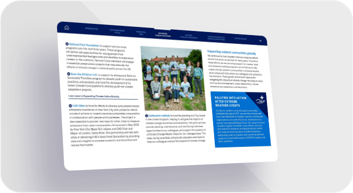 National Park Foundation to support service corps programs over the next three years. These programs will deliver job opportunities for young people from underrepresented backgrounds and identities to experience careers in the outdoors. Service Corps members will engage in essential preservation projects that help alleviate the effects of climate change in national parks across the US. Save the Children U.K. to support its Adolescent Skills for Successful Transition program to educate youth on sustainable practices and products and fund the development of its Green Climate Fund pipeline to develop youth-led climate adaptation projects. Learn more in Supporting Climate Action Globally. C40 Cities to fund its efforts to develop consumption-based emissions inventories in New York City and London to inform a suite of actions to incentivize more sustainable consumption in collaboration with people and businesses. The project is also expected to pioneer new ways for other cities to measure emissions from urban consumption. Announced in May 2022 by New York City Mayor Eric Adams and C40 Chair and Mayor of London, Sadiq Khan, this partnership will help both cities in delivering C40’s Good Food Declaration by providing data and insights to increase access to nutritious food and reduce food waste. Earthwatch Institute to fund the planting of a Tiny Forest in the United Kingdom, helping to mitigate the impacts of climate change and enhance biodiversity. The grant will also provide planting, maintenance, and monitoring volunteer opportunities to our colleagues and support the creation of a Climate Change Master Class for our colleague base. The class, led by scientists, will provide education and tools to help our colleagues reduce the impacts of climate change. Supporting resilient communities globally We continued to fund disaster relief and response efforts around the world, as we have for many years. To build on these efforts, we are providing support for disaster relief and resilience building programs and initiatives to help create climate-resilient communities in extreme weather prone areas and cities where our colleagues and customers live and work. These grants aim to build capacity for mitigating the impacts of climate change, focusing on areas such as land management, water stewardship, climate resilience and adaptation, and education. RALLYING INTO ACTION AFTER EXTREME WEATHER EVENTS As extreme weather events disrupted communities worldwide throughout 2021, we were there to help with more than $650,000 for disaster response, working with organizations such as the Red Cross, Feeding America, and the International Medical Corps. Our support focused on addressing the immediate needs of those who have been injured or displaced, providing temporary shelter and meals for first responders and affected families, distributing clean-up supplies, and connecting affected people to mental health support, COVID-19 supplies, and other assistance. INTRODUCTION PROMOTING DE&I ADVANCING CLIMATE SOLUTIONS BUILDING FINANCIAL CONFIDENCE OUR ESG GOVERNANCE & OPERATING RESPONSIBLY SUPPORTING DATA OUR COMMITMENT TO ESG 54