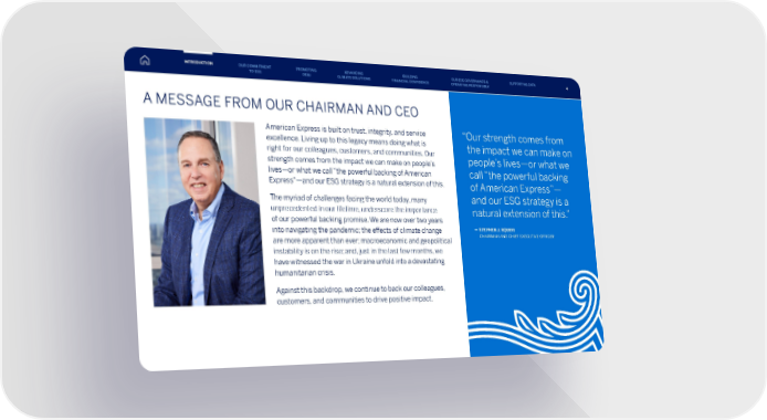 A MESSAGE FROM OUR CHAIRMAN AND CEO “ Our strength comes from the impact we can make on people’s lives—or what we call “the powerful backing of American Express”— and our ESG strategy is a natural extension of this.” — STEPHEN J. SQUERI CHAIRMAN AND CHIEF EXECUTIVE OFFICER American Express is built on trust, integrity, and service excellence. Living up to this legacy means doing what is right for our colleagues, customers, and communities. Our strength comes from the impact we can make on people’s lives—or what we call “the powerful backing of American Express”—and our ESG strategy is a natural extension of this. The myriad of challenges facing the world today, many unprecedented in our lifetime, underscore the importance of our powerful backing promise. We are now over two years into navigating the pandemic; the effects of climate change are more apparent than ever; macroeconomic and geopolitical instability is on the rise; and, just in the last few months, we have witnessed the war in Ukraine unfold into a devastating humanitarian crisis. Against this backdrop, we continue to back our colleagues, customers, and communities to drive positive impact. INTRODUCTION PROMOTING DE&I ADVANCING CLIMATE SOLUTIONS BUILDING FINANCIAL CONFIDENCE OUR ESG GOVERNANCE & OPERATING RESPONSIBLY SUPPORTING DATA OUR COMMITMENT TO ESG 4