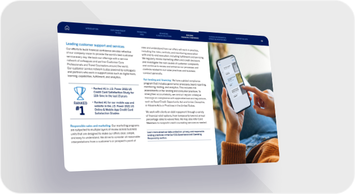 view and understand how our offers will work in practice, including the risks, controls, and monitoring associated with end-to-end execution, including fulfillment and servicing. We regularly review marketing offers and credit decisions and investigate the root causes of customer complaints and continue to review and enhance our processes and controls related to our sales practices and business conduct generally. Fair lending and financing: We have a global compliance program that includes governance processes, board reporting, monitoring, testing, and analytics. This includes risk assessments on fair lending and consumer practices. To strengthen accountability, we conduct regular colleague trainings on compliance with applicable laws and regulations, such as Equal Credit Opportunity Act and Unfair, Deceptive, or Abusive Acts or Practices in the United States. We work with clients on debt repayment through a variety of financial relief options, from temporarily lowered annual percentage rates to waived fees. We may also refer Card Members to nonprofit credit counseling services as needed. Learn more about our data protection, privacy, and responsible lending practices in the Our ESG Governance and Operating Responsibly section. Leading customer support and services Our efforts to build financial confidence are also reflective of our company vision to provide the world’s best customer service every day. We back our offerings with a service network of colleagues and partner Customer Care Professionals and Travel Counselors around the world. Our customer service network is also powered by colleagues and partners who work in support areas such as digital tools, learning, capabilities, fulfillment, and analytics. Responsible sales and marketing: Our marketing programs are subjected to multiple layers of review across business units that are designed to make our offers clear, simple, and easy to understand. We strive to consider all reasonable interpretations from a customer’s or prospect’s point of • Ranked #1 in J.D. Power 2021 US Credit Card Satisfaction Study for 11th time in the last 15 years • Ranked #1 for our mobile app and website in the J.D. Power 2021 US Online & Mobile App Credit Card Satisfaction Studies RANKED # 1 INTRODUCTION PROMOTING DE&I ADVANCING CLIMATE SOLUTIONS BUILDING FINANCIAL CONFIDENCE OUR ESG GOVERNANCE & OPERATING RESPONSIBLY SUPPORTING DATA OUR COMMITMENT TO ESG 68