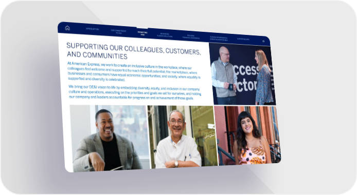SUPPORTING OUR COLLEAGUES, CUSTOMERS, AND COMMUNITIES At American Express, we work to create an inclusive culture in the workplace, where our colleagues feel welcome and supported to reach their full potential; the marketplace, where businesses and consumers have equal economic opportunities; and society, where equality is supported and diversity is celebrated. We bring our DE&I vision to life by embedding diversity, equity, and inclusion in our company culture and operations, executing on the priorities and goals we set for ourselves, and holding our company and leaders accountable for progress on and achievement of those goals. INTRODUCTION PROMOTING DE&I ADVANCING CLIMATE SOLUTIONS BUILDING FINANCIAL CONFIDENCE OUR ESG GOVERNANCE & OPERATING RESPONSIBLY SUPPORTING DATA OUR COMMITMENT TO ESG 23