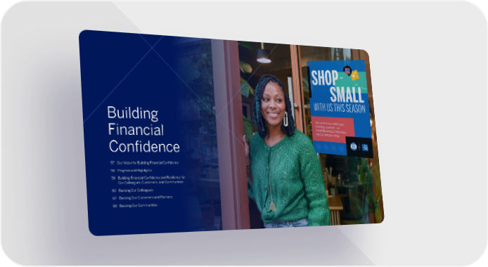 57 Our Vision for Building Financial Confidence 58 Progress and Highlights 59 Building Financial Confidence and Resilience for Our Colleagues, Customers, and Communities 60 Backing Our Colleagues 62 Backing Our Customers and Partners 69 Backing Our Communities Building Financial Confidence