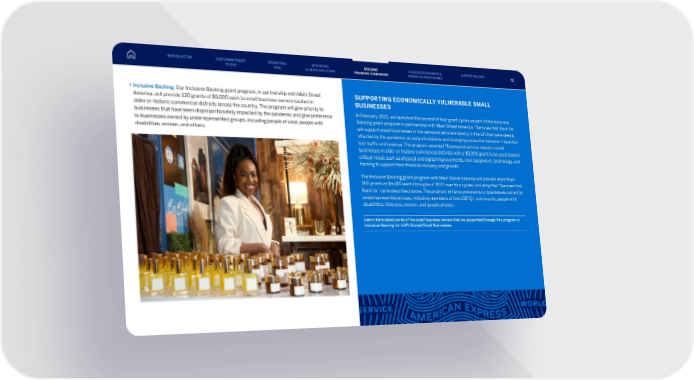 INTRODUCTION Section 4 Section NAME 3 Section NAME 7 Section 2 Section 6 Section NAME 1 38 • Inclusive Backing: Our Inclusive Backing grant program, in partnership with Main Street America, will provide 330 grants of $5,000 each to small business owners located in older or historic commercial districts across the country. The program will give priority to businesses that have been disproportionately impacted by the pandemic and give preference to businesses owned by underrepresented groups, including people of color, people with disabilities, women, and others. SUPPORTING ECONOMICALLY VULNERABLE SMALL BUSINESSES In February 2022, we launched the second of four grant cycles as part of the Inclusive Backing grant program in partnership with Main Street America. “Services that Back Us” will support small businesses in the personal service industry in the US that were deeply affected by the pandemic as early shutdowns and changing consumer behavior impacted foot traffic and revenue. The program awarded 75 personal service industry small businesses in older or historic commercial districts with a $5,000 grant to be used toward critical needs such as physical and digital improvements, new equipment, technology, and training to support their financial recovery and growth. The Inclusive Backing grant program with Main Street America will provide more than 300 grants of $5,000 each throughout 2022 over four cycles, including the “Services that Back Us” cycle described above. The program will give preference to businesses owned by underrepresented groups, including members of the LGBTQ+ community, people with disabilities, Veterans, women, and people of color. Learn more about some of the small business owners that we supported through this program in Inclusive Backing for AAPI-Owned Small Businesses. INTRODUCTION PROMOTING DE&I ADVANCING CLIMATE SOLUTIONS BUILDING FINANCIAL CONFIDENCE OUR ESG GOVERNANCE & OPERATING RESPONSIBLY SUPPORTING DATA OUR COMMITMENT TO ESG 72