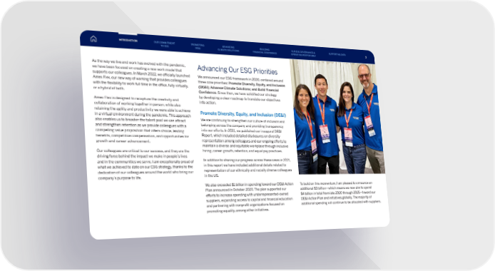 As the way we live and work has evolved with the pandemic, we have been focused on creating a new work model that supports our colleagues. In March 2022, we officially launched Amex Flex, our new way of working that provides colleagues with the flexibility to work full time in the office, fully virtually, or a hybrid of both. Amex Flex is designed to recapture the creativity and collaboration of working together in person, while also retaining the agility and productivity we were able to achieve in a virtual environment during the pandemic. This approach also enables us to broaden the talent pool we can attract and strengthen retention as we provide colleagues with a compelling value proposition that offers choice, leading benefits, competitive compensation, and opportunities for growth and career advancement. Our colleagues are critical to our success, and they are the driving force behind the impact we make in people’s lives and in the communities we serve. I am exceptionally proud of what we achieved to date on our ESG strategy, thanks to the dedication of our colleagues around the world who bring our company’s purpose to life. Advancing Our ESG Priorities We announced our ESG framework in 2020, centered around three core priorities: Promote Diversity, Equity, and Inclusion (DE&I); Advance Climate Solutions; and Build Financial Confidence . Since then, we have solidified our strategy by developing a clear roadmap to translate our objectives into action. Promote Diversity, Equity, and Inclusion (DE&I) We are continuing to strengthen our culture of inclusion and belonging across the company and providing transparency into our efforts. In 2021, we published our inaugural DE&I Report, which included detailed disclosures on diversity representation among colleagues and our ongoing efforts to maintain a diverse and equitable workplace through inclusive hiring, career growth, retention, and equal pay practices. In addition to sharing our progress across these areas in 2021, in this report we have included additional details related to representation of our ethnically and racially diverse colleagues in the US. We also exceeded $1 billion in spending toward our DE&I Action Plan announced in October 2020. The plan supported our efforts to increase spending with underrepresented-owned suppliers, expanding access to capital and financial education and partnering with nonprofit organizations focused on promoting equality, among other initiatives. To build on this momentum, I am pleased to announce an additional $3 billion—which means we now aim to spend $4 billion in total from late 2020 through 2025—toward our DE&I Action Plan and initiatives globally. The majority of additional spending will continue to be allocated with suppliers. INTRODUCTION PROMOTING DE&I ADVANCING CLIMATE SOLUTIONS BUILDING FINANCIAL CONFIDENCE OUR ESG GOVERNANCE & OPERATING RESPONSIBLY SUPPORTING DATA OUR COMMITMENT TO ESG 5