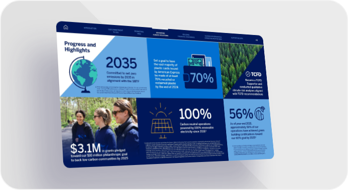 56% As of year-end 2021, approximately 56% of our operations have achieved green building certifications toward our 60% goal by 2025 4 Set a goal to have the vast majority of plastic cards issued by American Express be made of at least 70% recycled or reclaimed plastic by the end of 2024 $3.1M in grants pledged toward our $10 million philanthropic goal to back low-carbon communities by 2025 4. Green building certified percentage is represented by the total square footage of leased or owned facilities actively occupied by American Express (excluding parking lot square footage) certified under a global or locally recognized third-party environmental building rating system as meeting their performance criteria (LEED, BREEAM, NABERS, GreenMark, HQE and Effinergie+). Committed to net-zero emissions by 2035 in alignment with the SBTi 2 2035 Became a TCFD Supporter and conducted qualitative climate risk analyses aligned with TCFD recommendations Progress and Highlights 100% Carbon neutral operations powered by 100% renewable electricity since 2018 3 3. Achieved carbon neutral operations for Scope 1 (direct emissions from sources owned or controlled by American Express), Scope 2 (indirect market-based emissions), and Scope 3 (waste and employee business travel, including third-party air, rail and rental cars) emissions through renewable energy credits, carbon offsets, and reduced GHG emissions. Operations include all our managed facilities, field sites, and data centers. Managed facilities are individual properties operationally managed by our global real estate team and housing critical business functions. Field sites are individual properties that are not operationally managed by our global real estate team but directly by our business units. They are typically smaller sites, less than 30,000 square feet (including airport lounges, foreign exchange kiosks, and sales offices) that are owned or leased by American Express. For more detailed data on our consumption of electricity, renewable energy, and Scope 1, 2, and 3 emissions, please see the Environmental Performance Data Summary and Limited Assurance Statement of GHG Emissions in the Supporting Data: Our Commitment to Transparency section at the end of this report. 2. American Express is following the methodology of the SBTi for our commitment to net-zero by 2035, which covers all Scope 1 and 2 emissions and a minimum of two-thirds of total Scope 3 emissions in conformance with the GHG Protocol Corporate Value Chain (Scope 3) Accounting and Reporting Standard. 70% INTRODUCTION PROMOTING DE&I ADVANCING CLIMATE SOLUTIONS BUILDING FINANCIAL CONFIDENCE OUR ESG GOVERNANCE & OPERATING RESPONSIBLY SUPPORTING DATA OUR COMMITMENT TO ESG 40