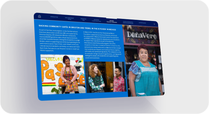 BACKING COMMUNITY CAFÉS IN BRIXTON AND ‘REBEL IN THE KITCHEN’ IN MEXICO As part of the Dine Local program, run by the International Downtown Association and Brixton BID, and supported by American Express, 10 independent Brixton restaurants received £5,000 grants to make critical improvements to drive their business forward. Among the recipients is Lounge Brixton, which is supporting local artists by expanding its live performance space; Papa’s Café, a park-based community cafe serving local residents; and family-run restaurant Banh Banh Café, that plans to use the grant money to install new kitchen equipment. In March 2022, the IDA and the Placemaking México Foundation, supported by American Express, announced ten restaurants in Mexico that would receive the equivalent of $7,500 in Mexican pesos for adjustments and renovations to support their operations as part of the Backing International Small Restaurants program. One of the recipients is Doña Vero. Located at Colonia La Roma Sur, the eponymously named restaurant is a Mexican kitchen concept that combines pre-Hispanic and traditional flavors together with exotic and nutritional ingredients. The restaurant, run by its namesake, brings inclusion to gastronomy, running special tastings for people with disabilities and supporting local causes and businesses. INTRODUCTION PROMOTING DE&I ADVANCING CLIMATE SOLUTIONS BUILDING FINANCIAL CONFIDENCE OUR ESG GOVERNANCE & OPERATING RESPONSIBLY SUPPORTING DATA OUR COMMITMENT TO ESG 71