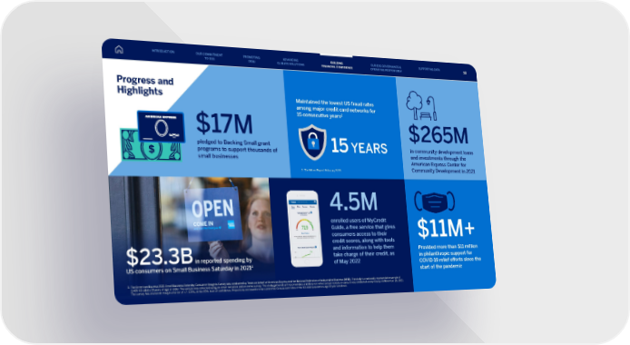 $11M+ Provided more than $11 million in philanthropic support for COVID-19 relief efforts since the start of the pandemic pledged to Backing Small grant programs to support thousands of small businesses $17M $23.3B in reported spending by US consumers on Small Business Saturday in 2021 3 4.5M enrolled users of MyCredit Guide, a free service that gives consumers access to their credit scores, along with tools and information to help them take charge of their credit, as of May 2022 3. The American Express 2021 Small Business Saturday Consumer Insights Survey was conducted by Teneo on behalf of American Express and the National Federation of Independent Business (NFIB). The study is a nationally representative sample of 2,426 US adults 18 years of age or older. The sample was collected using an email invitation and an online survey. The study gathered self-reported data and does not reflect actual receipts or sales. It was conducted anonymously on November 28, 2021. The survey has an overall margin of error of +/- 2.0%, at the 95% level of confidence. Projections are based on the current US Census estimates of the US adult population, age 18 years and over. 2. The Nilson Report, February 2022. 15 YEARS Maintained the lowest US fraud rates among major credit card networks for 15 consecutive years 2 $265M in community development loans and investments through the American Express Center for Community Development in 2021 Progress and Highlights INTRODUCTION PROMOTING DE&I ADVANCING CLIMATE SOLUTIONS BUILDING FINANCIAL CONFIDENCE OUR ESG GOVERNANCE & OPERATING RESPONSIBLY SUPPORTING DATA OUR COMMITMENT TO ESG 58
