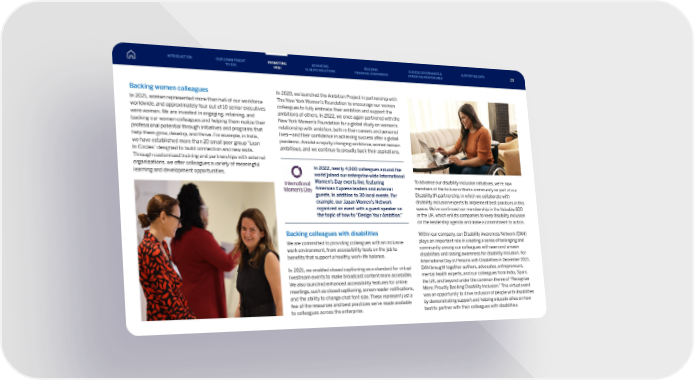 Backing women colleagues In 2021, women represented more than half of our workforce worldwide, and approximately four out of 10 senior executives were women. We are invested in engaging, retaining, and backing our women colleagues and helping them realize their professional potential through initiatives and programs that help them grow, develop, and thrive. For example, in India, we have established more than 20 small peer group “Lean In Circles” designed to build connection and new skills. Through customized training and partnerships with external organizations, we offer colleagues a variety of meaningful learning and development opportunities. In 2020, we launched the Ambition Project in partnership with The New York Women’s Foundation to encourage our women colleagues to fully embrace their ambition and support the ambitions of others. In 2022, we once again partnered with the New York Women’s Foundation for a global study on women’s relationship with ambition, both in their careers and personal lives—and their confidence in achieving success after a global pandemic. Amidst a rapidly changing workforce, women remain ambitious, and we continue to proudly back their aspirations. Backing colleagues with disabilities We are committed to providing colleagues with an inclusive work environment, from accessibility tools on the job to benefits that support a healthy work-life balance. In 2021, we enabled closed captioning as a standard for virtual livestream events to make broadcast content more accessible. We also launched enhanced accessibility features for online meetings, such as closed captioning, screen reader notifications, and the ability to change chat font size. These represent just a few of the resources and best practices we’ve made available to colleagues across the enterprise. To advance our disability inclusion initiatives, we’re now members of the Inclusion Works community as part of our Disability:IN partnership, in which we collaborate with disability inclusion experts to implement best practices in this space. We’ve continued our membership in the Valuable 500 in the UK, which enlists companies to keep disability inclusion on the leadership agenda and make a commitment to action. Within our company, our Disability Awareness Network (DAN) plays an important role in creating a sense of belonging and community among our colleagues with seen and unseen disabilities and raising awareness for disability inclusion. For International Day of Persons with Disabilities in December 2021, DAN brought together authors, advocates, entrepreneurs, mental health experts, and our colleagues from India, Spain, the UK, and beyond under the common theme of “Recognize More: Proudly Backing Disability Inclusion.” This virtual event was an opportunity to drive inclusion of people with disabilities by demonstrating support and helping educate allies on how best to partner with their colleagues with disabilities. In 2022, nearly 4,000 colleagues around the world joined our enterprise-wide International Women’s Day events live, featuring American Express leaders and external guests, in addition to 30 local events. For example, our Japan Women’s Network organized an event with a guest speaker on the topic of how to “Design Your Ambition.” INTRODUCTION PROMOTING DE&I ADVANCING CLIMATE SOLUTIONS BUILDING FINANCIAL CONFIDENCE OUR ESG GOVERNANCE & OPERATING RESPONSIBLY SUPPORTING DATA OUR COMMITMENT TO ESG 29