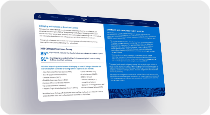 2021 Colleague Experience Survey 85 % of participants indicated that they feel valued as a colleague at American Express 91 % of participants responded that they feel supported by their leader in making decisions about their well-being Belonging and inclusion at American Express To support our efforts to create an inclusive and welcoming culture for our colleagues, we introduced two trainings in 2020: a “Strengthening Our Culture of Belonging and Inclusion” course and a “Belonging at Amex” workshop. We supplemented these trainings with conversations and informational sessions on how colleagues can contribute to a culture of inclusion. Throughout, colleagues had access to numerous resources on leading inclusively, having meaningful conversations, and making their voices heard. To further help colleagues feel a sense of belonging, we have 14 Colleague Networks, with over 100 chapters worldwide, for sharing common experiences and interests: • Asian Network at American Express (ANA) • Black Engagement Network (BEN) • Christian Network (SALT) • Disability Awareness Network (DAN) • Families at American Express Network • Generations Network (NextGen) • Hispanic Origin & Latin American Network (HOLA) • Jewish Network (CHAI) • Muslim Network (PEACE) • PRIDE+ Network • Veterans Network (VET) • Virtual Office Network • Women in Technology Network (WIT) • Women’s Interest Network (WIN) In addition to our Colleague Networks, we have nine Diversity, Equity, and Inclusion Councils across Business Units and in office locations to address local priorities. EXPANSIVE AND IMPACTFUL FAMILY SUPPORT For US colleagues who use adoption, surrogacy, or egg/sperm donors, we offer reimbursement that covers expenses up to $35,000—for up to two events, with a lifetime maximum of $70,000. Those who undergo reproductive treatments are eligible for up to $35,000 in medical assistance. “ We adopted our son and in fact, Amex has been there for us since day one and throughout every step of the way,” says Sean B., an analyst in our Global Risk and Compliance department. “The company’s family planning and assistance program provided us with the financial support to adopt earlier than what we thought was possible. Additionally, the family concierge benefit helped us throughout the adoption process and is a resource we continue to use when we need childcare.” “ The dependent care flexible spending account has also provided comfort financially,” Sean added, “which has especially been helpful during these current times when we’re doing the best we can in a lot of situations that are entirely new and the challenges we’ve had to navigate around due to COVID.” This support continues after colleagues welcome their new family members. Under our gender-neutral parental leave policy, eligible colleagues in the United States can take up to 20 weeks parental leave with full base pay, whether they’re welcoming a child through pregnancy, adoption, or surrogacy. We also provide six to eight weeks of additional leave if medically necessary. We also provide colleagues in Canada, the UK, and the US access to in-home or center- based childcare when their regular arrangements fall through, as well as connection with 24/7 consultants who can help arrange in-home care for an adult loved one recovering from an illness or injury. INTRODUCTION PROMOTING DE&I ADVANCING CLIMATE SOLUTIONS BUILDING FINANCIAL CONFIDENCE OUR ESG GOVERNANCE & OPERATING RESPONSIBLY SUPPORTING DATA OUR COMMITMENT TO ESG 28