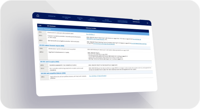 Code GRI Disclosure Reference/Location Economic Disclosures 201-1 Direct economic value generated and distributed Form 10-K Item 7 201-2 Financial implications and other risks and opportunities due to climate change 2021–2022 ESG Report: Advancing Climate Solutions on pages 38-55, TCFD Index on pages 103-109, Form 10-K Item 1A , 2021 CDP Climate Change Response (C2) 201-3 Defined benefit plan obligations and other retirement plans 2021–2022 ESG Report: Building Financial Confidence: Backing Our Colleagues on pages 60-61, Form 10-K Note 11: Retirement Plans on page 126, American Express Colleague Benefits Website GRI 203: Indirect Economic Impacts (2016) 203-1 Infrastructure investments and services supported 2021–2022 ESG Report: Advancing Climate Solutions: Moving to Net-Zero on pages 43-47 203-2 Significant indirect economic impacts 2021–2022 ESG Report: • Our Commitment to ESG on pages 8-18 • Promoting Diversity, Equity and Inclusion: Backing Our Communities on pages 35-37 • Advancing Climate Solutions: Backing Our Communities on pages 53-55 • Building Financial Confidence: Backing Our Communities on pages 69-75 GRI 205: Anti-Corruption (2016) 205-1 Operations assessed for risks related to corruption 2021–2022 ESG Report: Our Business Ethics on pages 82-83 205-2 Communication and training about anti-corruption policies and procedures 2021–2022 ESG Report: Our Business Ethics on pages 82-83. All colleagues must complete anti-corruption and bribery training tied to their annual compensation that includes information about applicable laws and regulations for their location. GRI 206: Anti-competitive Behavior (2016) 206-1 Legal actions for anti-competitive behavior, anti-trust, and monopoly practices Form 10-K Item 3 , Code of Conduct INTRODUCTION PROMOTING DE&I ADVANCING CLIMATE SOLUTIONS BUILDING FINANCIAL CONFIDENCE OUR ESG GOVERNANCE & OPERATING RESPONSIBLY SUPPORTING DATA OUR COMMITMENT TO ESG 116