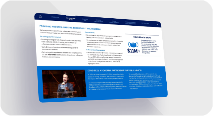 PROVIDING POWERFUL BACKING THROUGHOUT THE PANDEMIC We have provided support to our colleagues, customers, and communities over the last two years of the COVID-19 pandemic. For colleagues, this included: • Providing coverage of out-of-pocket medical and pharmacy costs related to COVID-19 testing and treatment for colleagues enrolled in our US medical plans. • Up to 16 hours of paid time off for obtaining COVID-19 vaccines and boosters. • Partnering with departments of health and hospitals in the US and India to host onsite vaccine clinics for our colleagues, families, and contractors. For customers: • We continued to help merchant partners do business while keeping their own customers and staff safe. • For businesses, we raised contactless transaction thresholds to reduce physical contact at points of sale and reminded merchants that we do not require them to collect Card Members’ signatures. In the communities we serve: • We provided more than $11 million in philanthropic support for COVID-19 relief efforts since the start of the pandemic through 2021, delivering financial support to nonprofits worldwide working on the front lines of the ongoing global crisis. One of these partners was (RED), which we’ve highlighted below. In 2021, we joined forces with (RED) to support equitable access to testing, treatment, and vaccines in response to the impact of COVID-19 in the world’s poorest countries. To shine a spotlight on the campaign, we partnered with (RED) to launch CODE (RED) alongside the reopening of Broadway, with Lin-Manuel Miranda joining American Express at a special performance of the hit musical “Hamilton.” CODE (RED): A POWERFUL PARTNERSHIP FOR PUBLIC HEALTH We provided Card Members with the option to use Membership Rewards points to make donations through PayPal’s Pay with Rewards feature to help provide COVID-19 testing, treatment, and vaccines for people most in need. We also donated $250,000 to COVID-19 relief efforts championed by (RED) and its partners, Fund for the Global Fund, and COVAX, and matched employee contributions to the campaign. Community support during the COVID-19 pandemic has remained a priority. We provided more than $11 million in philanthropic support for COVID-19 relief efforts since the start of the pandemic through 2021. $11M+ COVID-19 relief efforts 14 INTRODUCTION PROMOTING DE&I ADVANCING CLIMATE SOLUTIONS BUILDING FINANCIAL CONFIDENCE OUR ESG GOVERNANCE & OPERATING RESPONSIBLY SUPPORTING DATA OUR COMMITMENT TO ESG