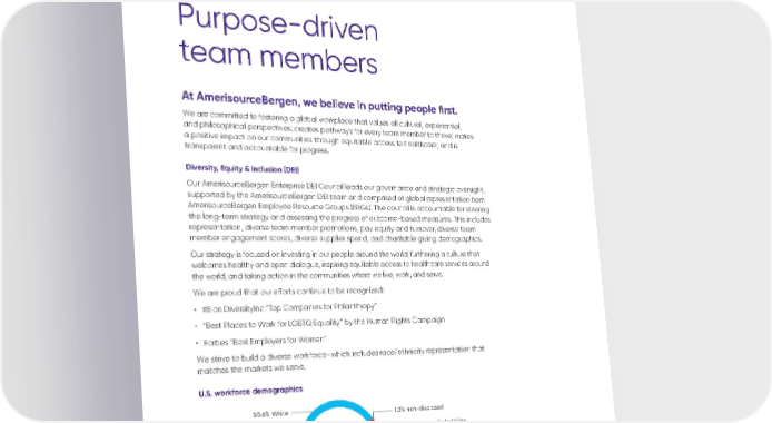 2021 Global Sustainability Report summary 03 02 Purpose-driven team members At AmerisourceBergen, we believe in putting people first. We are committed to fostering a global workplace that values all cultural, experiential, and philosophical perspectives; creates pathways for every team member to thrive; makes a positive impact on our communities through equitable access to healthcare; and is transparent and accountable for progress. Diversity, Equity & Inclusion (DEI) Our AmerisourceBergen Enterprise DEI Council leads our governance and strategic oversight, supported by the AmerisourceBergen DEI team and comprised of global representation from AmerisourceBergen Employee Resource Groups (ERGs). The council is accountable for steering the long-term strategy and assessing the progress of outcome-based measures. This includes representation, diverse team member promotions, pay equity and turnover, diverse team member engagement scores, diverse supplier spend, and charitable giving demographics. Our strategy is focused on investing in our people around the world, furthering a culture that welcomes healthy and open dialogue, inspiring equitable access to healthcare services around the world, and taking action in the communities where we live, work, and serve. We are proud that our efforts continue to be recognized: • #8 on DiversityInc “Top Companies for Philanthropy” • “Best Places to Work for LGBTQ Equality” by the Human Rights Campaign • Forbes “Best Employers for Women” We strive to build a diverse workforce–which includes race/ethnicity representation that matches the markets we serve. U.S. workforce demographics 9.2% Asian 3.1% other races/ethnicities 50.6% White 23.6% Black/African American 12.3% Hispanic/Latinx 1.3% non-disclosed For more information on our diversity, equity & inclusion efforts, click here .