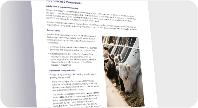 2021 Global Sustainability Report summary 09 03 | Resilient and sustainable operations Supply chain & stewardship Supply chain & responsible sourcing AmerisourceBergen’s commitment to healthier futures begins with our promise of efficiency and security at the first point a product enters the supply chain. As the distributor of tens of thousands of products, our infrastructure is built to enable secure, daily ordering and distribution. When there is strain on the supply chain, like during COVID-19 or a natural disaster, securing it is even more critical. AmerisourceBergen also seeks to buy goods and services from suppliers, contractors, and vendors who share our responsible-sourcing goals, and we expect partners to uphold our values as exemplified in our Supplier Statement. Product safety AmerisourceBergen’s state-of-the-art infrastructure and technology collectively comprise an efficient and secure pharmaceutical supply chain, supporting our regulatory compliance. • Continuously improving the traceability of our business processes and technology, enhancing patient safety • Educating stakeholders on the Drug Supply Chain Security Act (DSCSA) and leading the effort on technology solutions that will verify serial numbers on pharmaceutical products as part of the DSCSA regulatory requirement Sustainable food production We are taking a leading role in finding ways to feed a growing, hungry world. • Micro Technologies offers advanced technology solutions for livestock operations, helping producers optimize animal production and reduce the resources needed in that production process • The AmerisourceBergen Foundation partners with the National FFA Foundation to ensure we cultivate future talent and leadership to address sustainable food production by supporting their school-based agricultural education model, which offers training necessary for students to be successful in the areas of STEM within agriculture as well as other fields of study