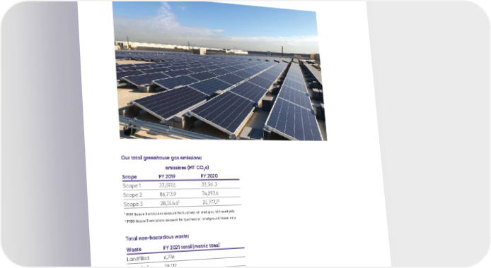 2021 Global Sustainability Report summary 08 03 | Resilient and sustainable operations Scope FY 2019 FY 2020 Scope 1 33,597.5 33,361.3 Scope 2 86,713.9 74,293.6 Scope 3 28,356.6 1 25,777.7 2 Waste FY 2021 total (metric tons) 1 Landfilled 6,776 Recycled 28,112 Incinerated 424 To ta l 35,311 1 FY19 Scope 3 emissions account for business air and ground travel only 2 FY20 Scope 3 emissions account for business air and ground travel only 1 Our waste data is representative of approximately 75 percent of our locations Total non-hazardous waste: emissions (MT CO 2 e) Our total greenhouse gas emissions: