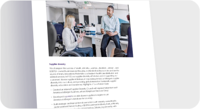 2021 Global Sustainability Report summary 04 02 | Purpose-driven team members Supplier diversity We champion the success of small-, minority-, women-, disabled-, veteran-, and LGBTQ+-owned businesses as they play a critical role in the economy and are the source of many innovations that make us a leader in healthcare distribution and related services. In FY21, our supplier diversity efforts focused on supporting our customers’ diverse supplier initiatives, incorporating AmerisourceBergen’s supplier diversity into our culture, and providing global internal and externally supplier diversity education and awareness. Highlights of our efforts include: • Created an internal Supplier Diversity Council with representation from each AmerisourceBergen business unit and Employee Resource Group • Developed a portal to enable diverse suppliers to register to join AmerisourceBergen’s database for sourcing • Built strategic and transactional connections with minority-owned banks and investment firms including a $25M investment in Liberty Bank, a Minority Depository Institution headquartered in New Orleans, in partnership with JPMorgan Chase