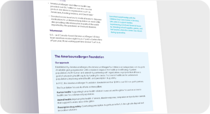 2021 Global Sustainability Report summary 11 04 | Healthy communities for all Product donations • AmerisourceBergen and Alliance Healthcare provided over $4.7 million in over-the-counter product donations to organizations such as Americares, Feeding America, and Direct Relief • Donated excess inventory to medical teams to dispense medications to underserved populations in need while also providing critical resources to parts of the world impacted by the pandemic and natural disasters Volunteerism U.S.- and Canada-based AmerisourceBergen full-time team members receive eight hours of paid volunteer time off per year; those working part time receive four hours. Launched a partnership with the Children Day Care Center in Sirvintai, Lithuania to support families experiencing social and financial issues by donating school supplies, games, and hot lunches when the center was closed during quarantine The AmerisourceBergen Foundation Our approach Established by AmerisourceBergen, the AmerisourceBergen Foundation is an independent, not-for-profit charitable giving organization with a mission to improve the health and well-being of patient populations–both human and animal–by partnering with organizations on projects that all have a goal of advancing health equity by funding the areas of access to healthcare for underserved populations, improving animal health, and prescription drug safety. In FY21, the AmerisourceBergen Foundation donated more than $7.7M to over 100 non-profit partners. The Foundation focuses its efforts on three pillars: Human health: Supporting human health-related causes around the globe focused on access to healthcare for underserved populations Animal health: Improving the health of service, disaster response, companion and production animals that support humans around the globe Prescription drug safety: Combating prescription drug misuse in the U.S. through safe disposal and innovative solutions