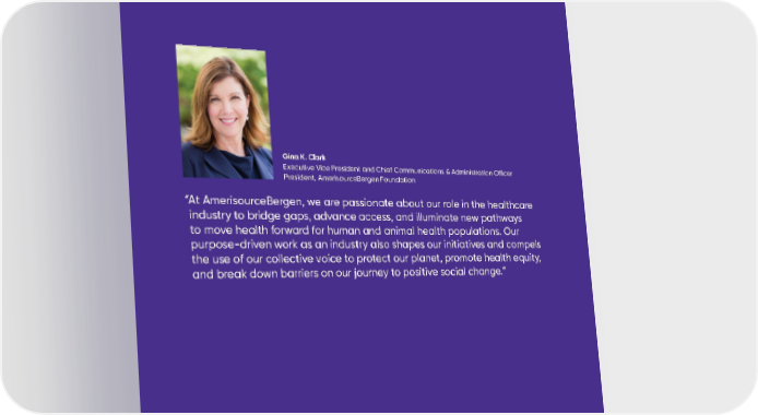 “ At AmerisourceBergen, we are passionate about our role in the healthcare industry to bridge gaps, advance access, and illuminate new pathways to move health forward for human and animal health populations. Our purpose-driven work as an industry also shapes our initiatives and compels the use of our collective voice to protect our planet, promote health equity, and break down barriers on our journey to positive social change.” Gina K. Clark Executive Vice President and Chief Communications & Administration Officer President, AmerisourceBergen Foundation