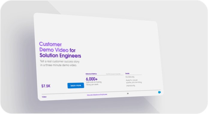 Customer Demo Video for Solution Engineers Tell a real customer success story in a three-minute demo video. Historical Metrics Note: Metrics are a guide, not a guarantee. Details 6,000+ For ISVs only. total visits to hosting Apply for one per $7.5K Learn more library per week. quarter, pick one listing. Internal only. Video Educate Salesforce Employees 24