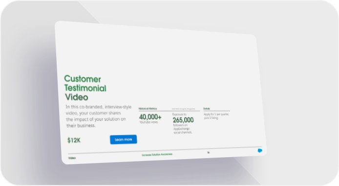 Customer Testimonial Video In this co-branded, interview-style Historical Metrics Note: Metrics are a guide, not a guarantee. Details video, your customer shares 40,000+ Exposure to Apply for 1 per quarter, the impact of your solution on 265,000 pick 1 listing. their business. YouTube views. followers on AppExchange social channels. $12K Learn more Video Increase Solution Awareness 16