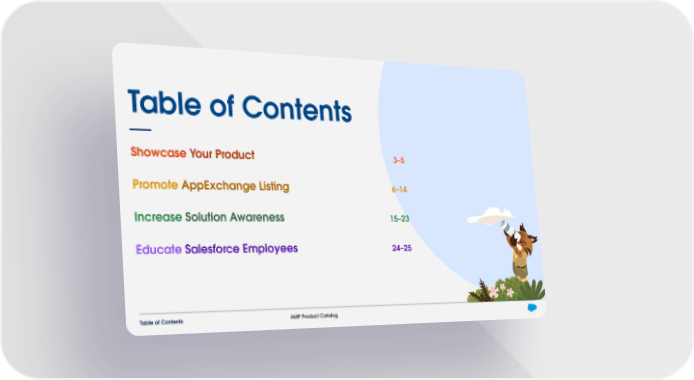 AMP Product Catalog - Advanced Page 1 Page 3Table of Contents Showcase Your Product 3 –5 Promote AppExchange Listing 6–14 Increase Solution Awareness 15–23 Educate Salesforce Employees 24–25 Table of Contents AMP Product Catalog