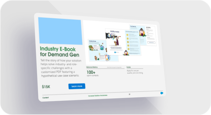 Industry E-Book for Demand Gen Tell the story of how your solution helps solve industry- and role- specific challenges with a Historical Metrics Note: Metrics are a guide, not a guarantee. Details customized PDF featuring a 100+ Apply for one per quarter, pick one listing. hypothetical use-case scenario. opt-in contacts. $15K Learn more Content Increase Solution Awareness 21